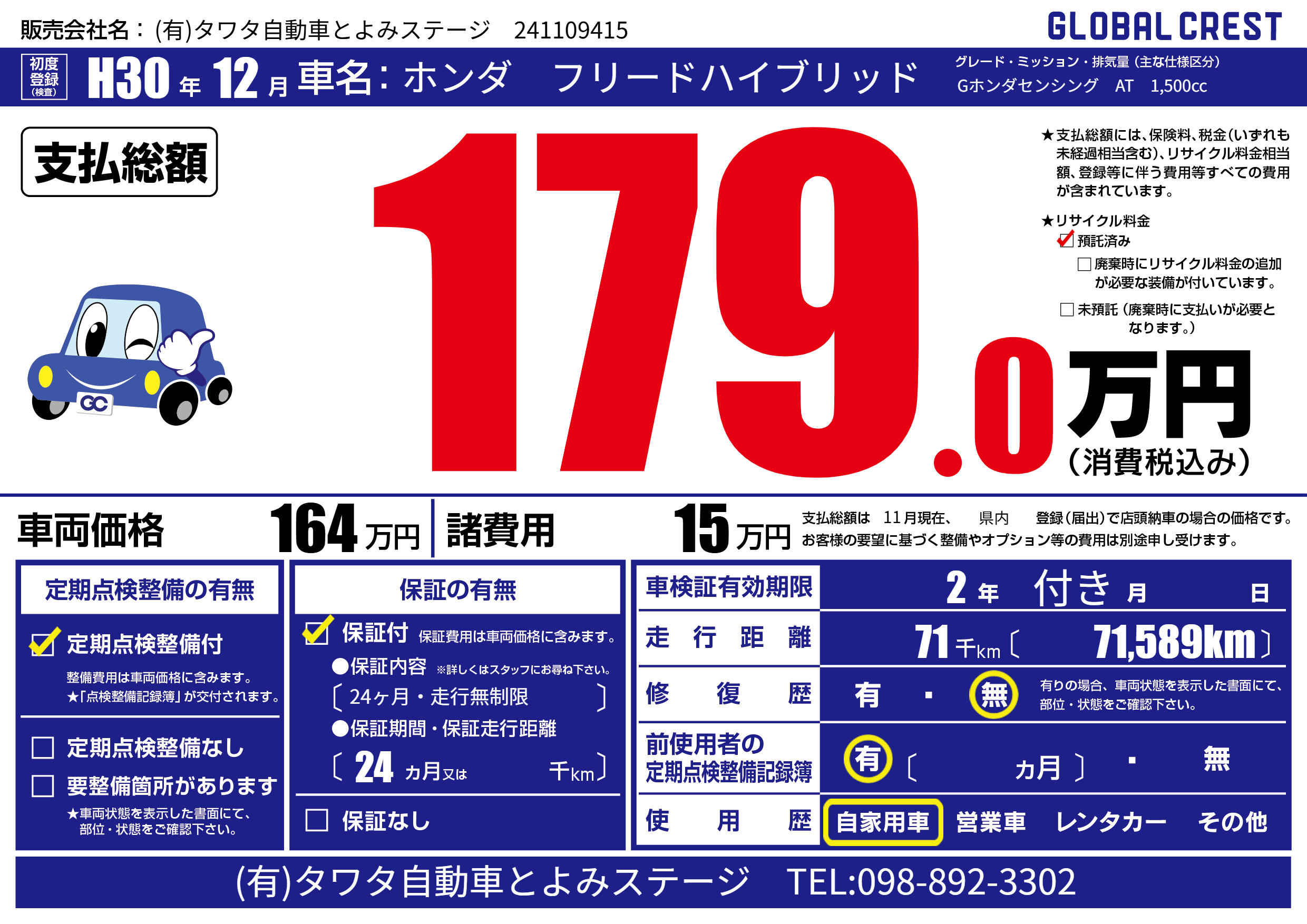 | 車名 | ホンダ フリードハイブリッド | グレード ミッション 排気量 |