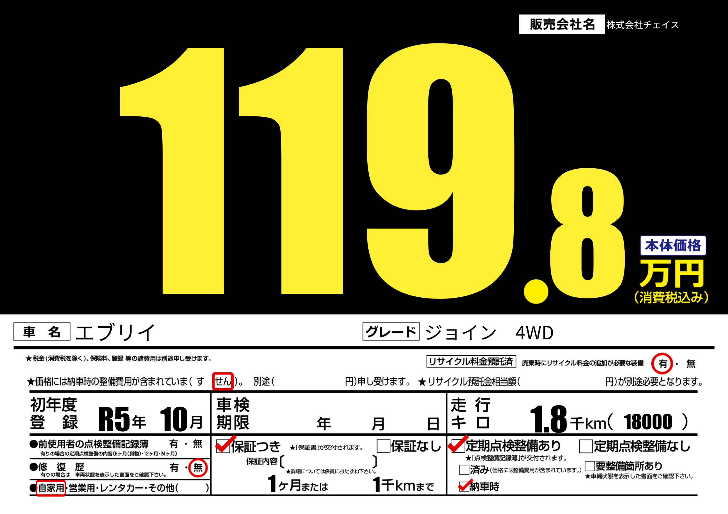 | 定期点検整備 | 定期点検整備あり 納車時あり | ||