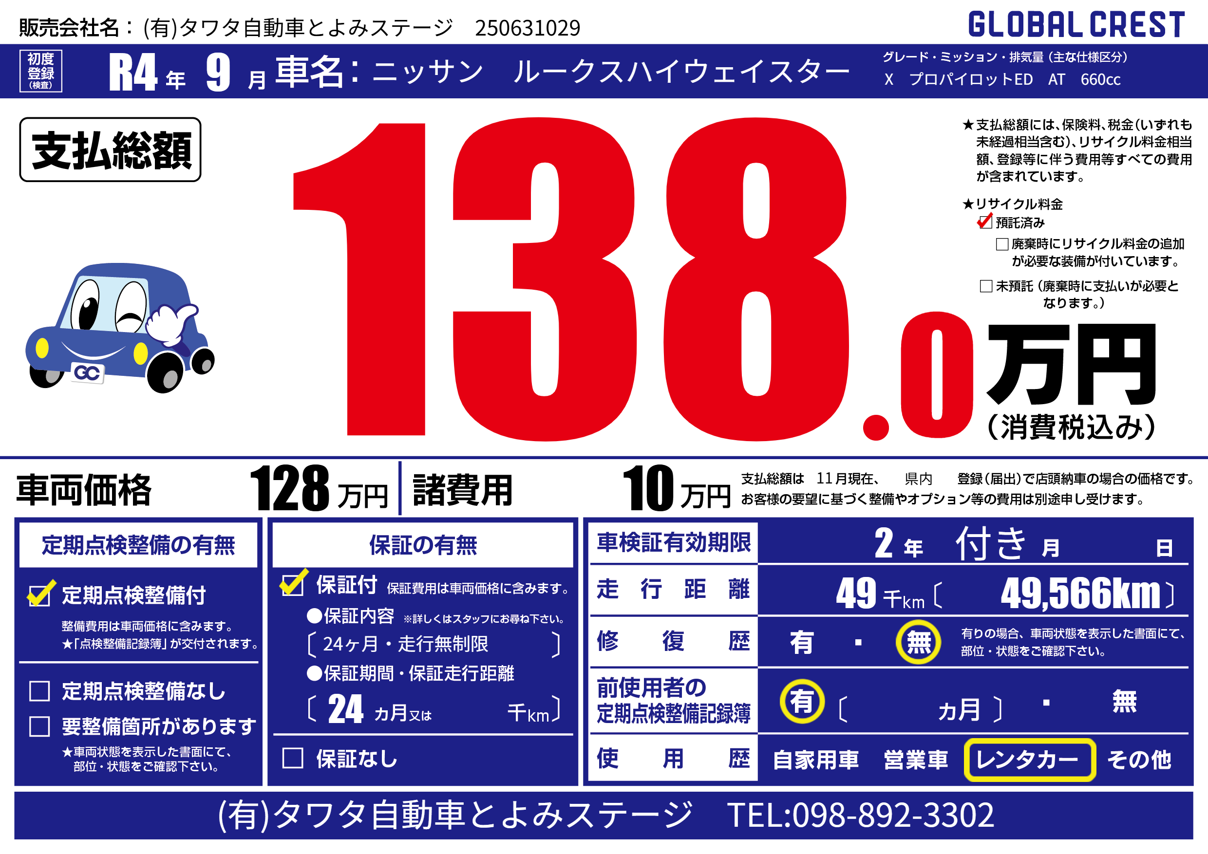 | 走行キロ | 4.9万km | 初年度登録 | R4年9月 |