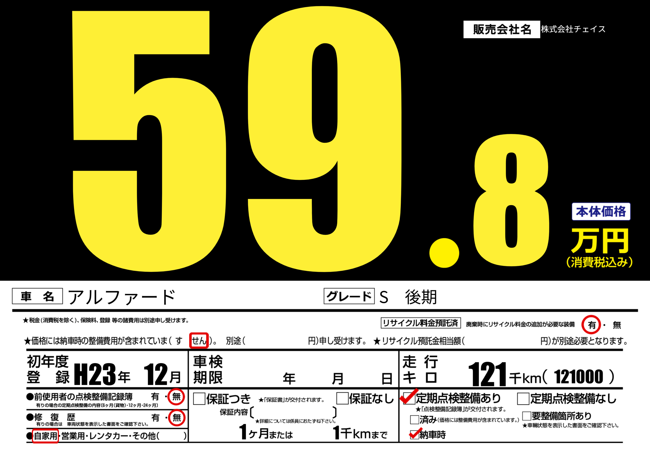 | 走行キロ | 12.1万km | 初年度登録 | H23年12月 |