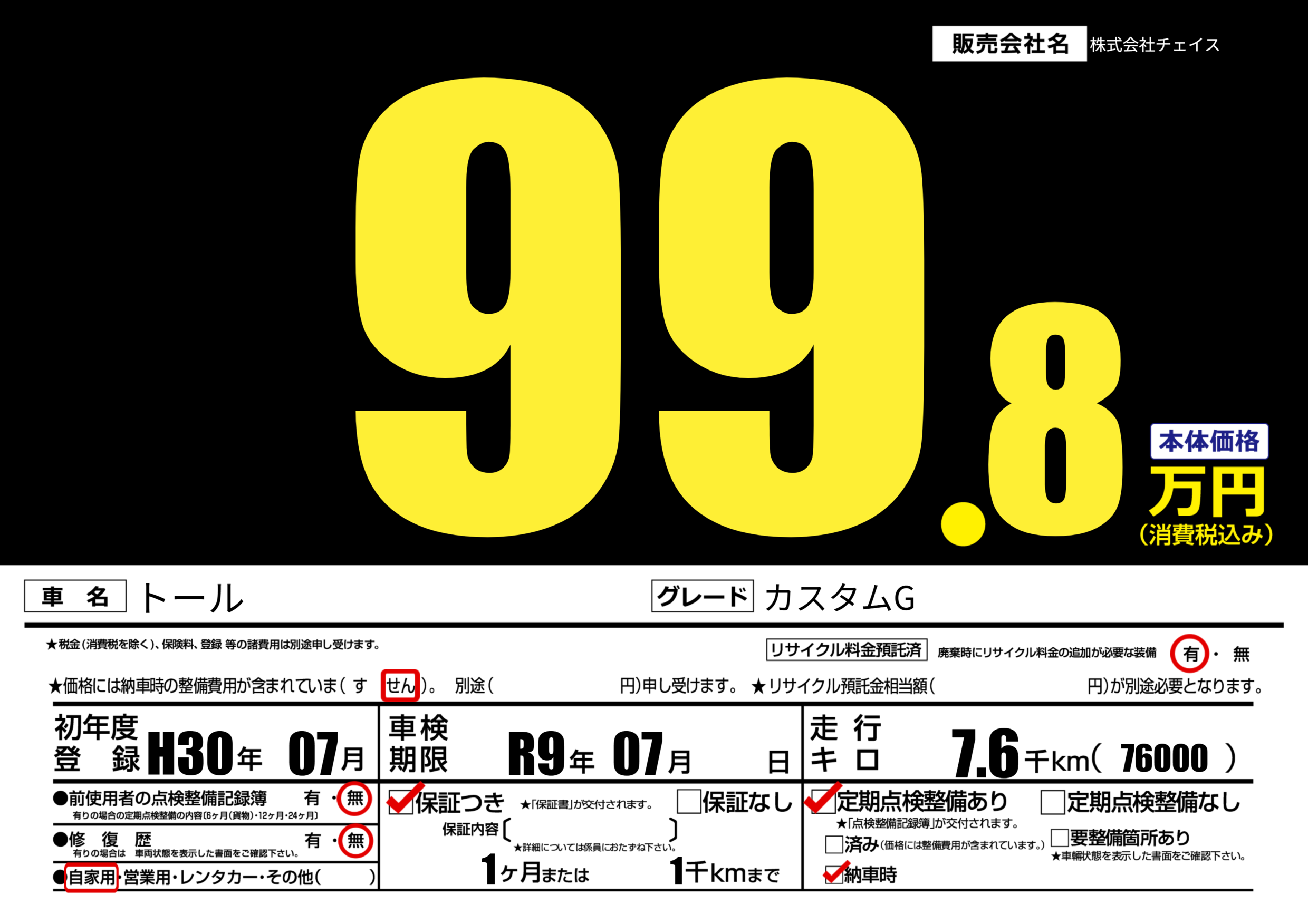 | 定期点検整備 | 定期点検整備あり 納車時あり | ||