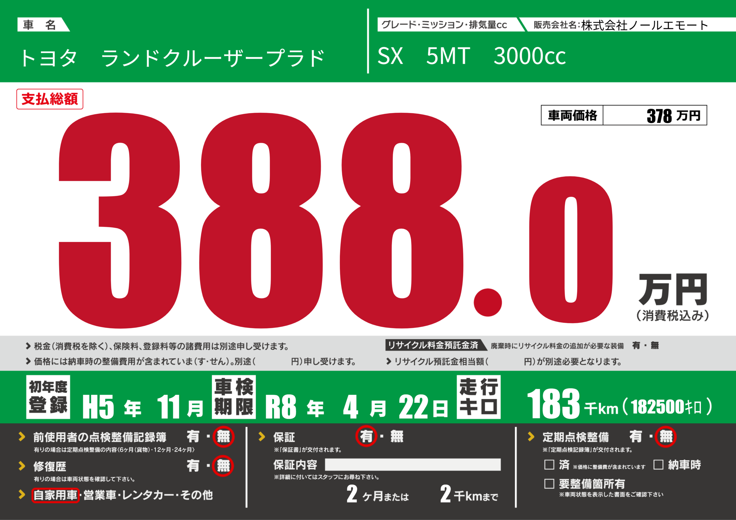 | 車名 | トヨタ ランドクルーザープラド | グレード ミッション 排気量 |