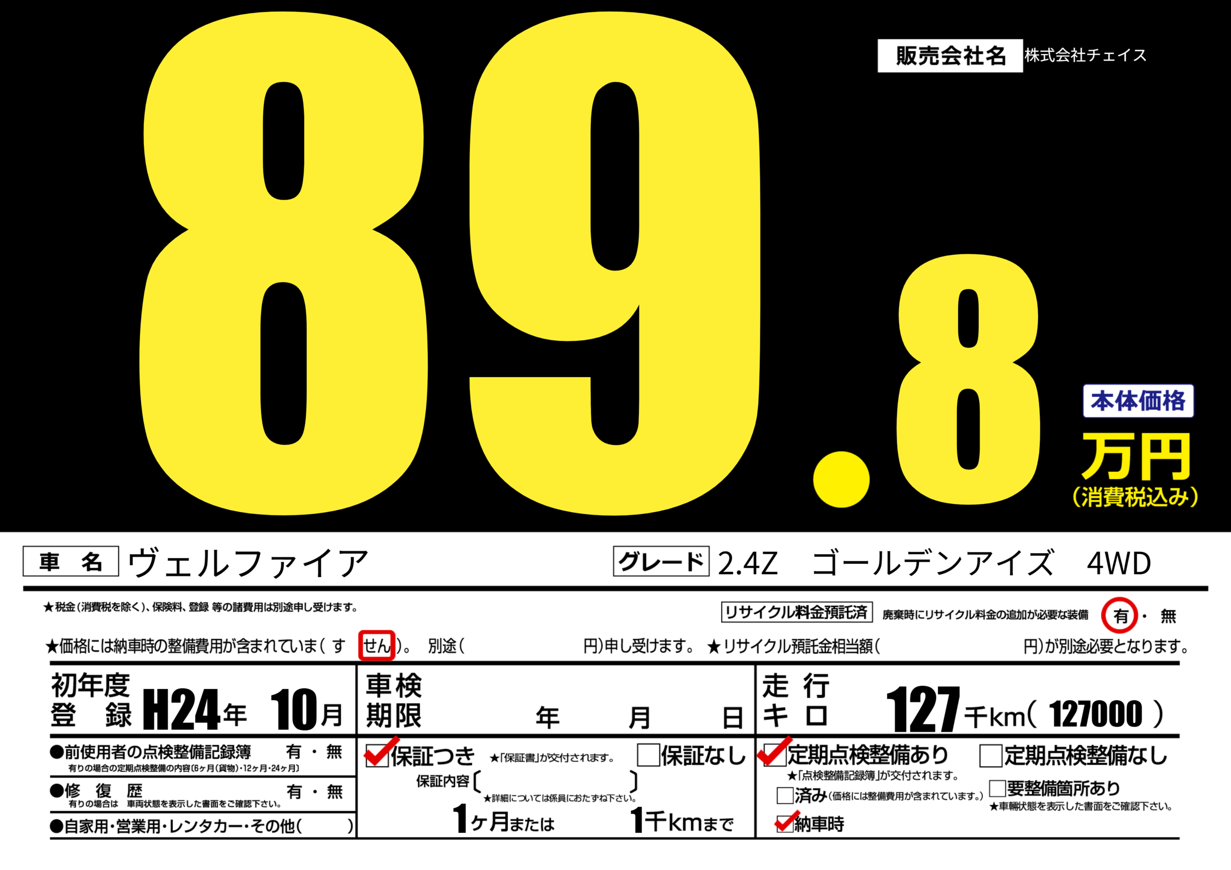 | 車名 | ヴェルファイア | グレード ミッション 排気量 |