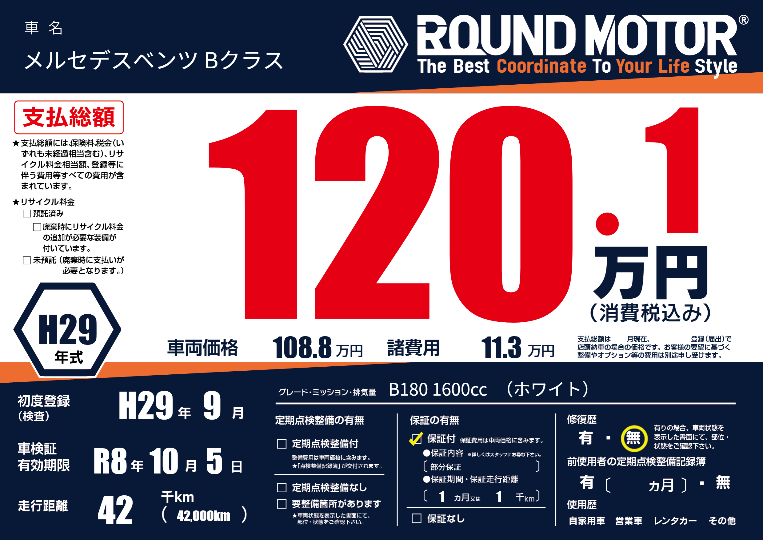 | 車名 | メルセデスベンツ Bクラス | グレード ミッション 排気量 |