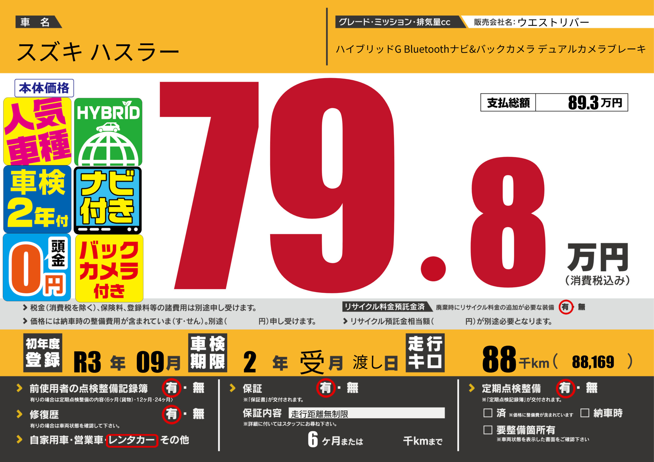 | 車名 | スズキ ハスラー | グレード ミッション 排気量 |
