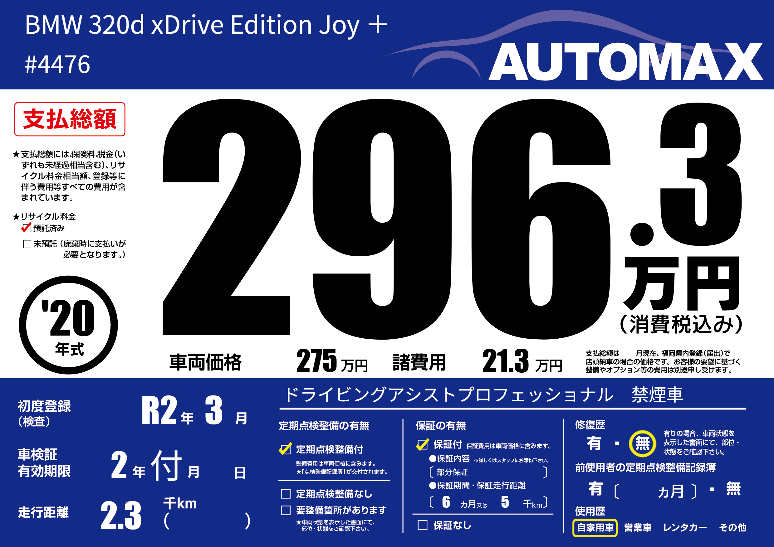 | 車名 | BMW 320d xDrive Edition Joy + | グレード ミッション 排気量 |
