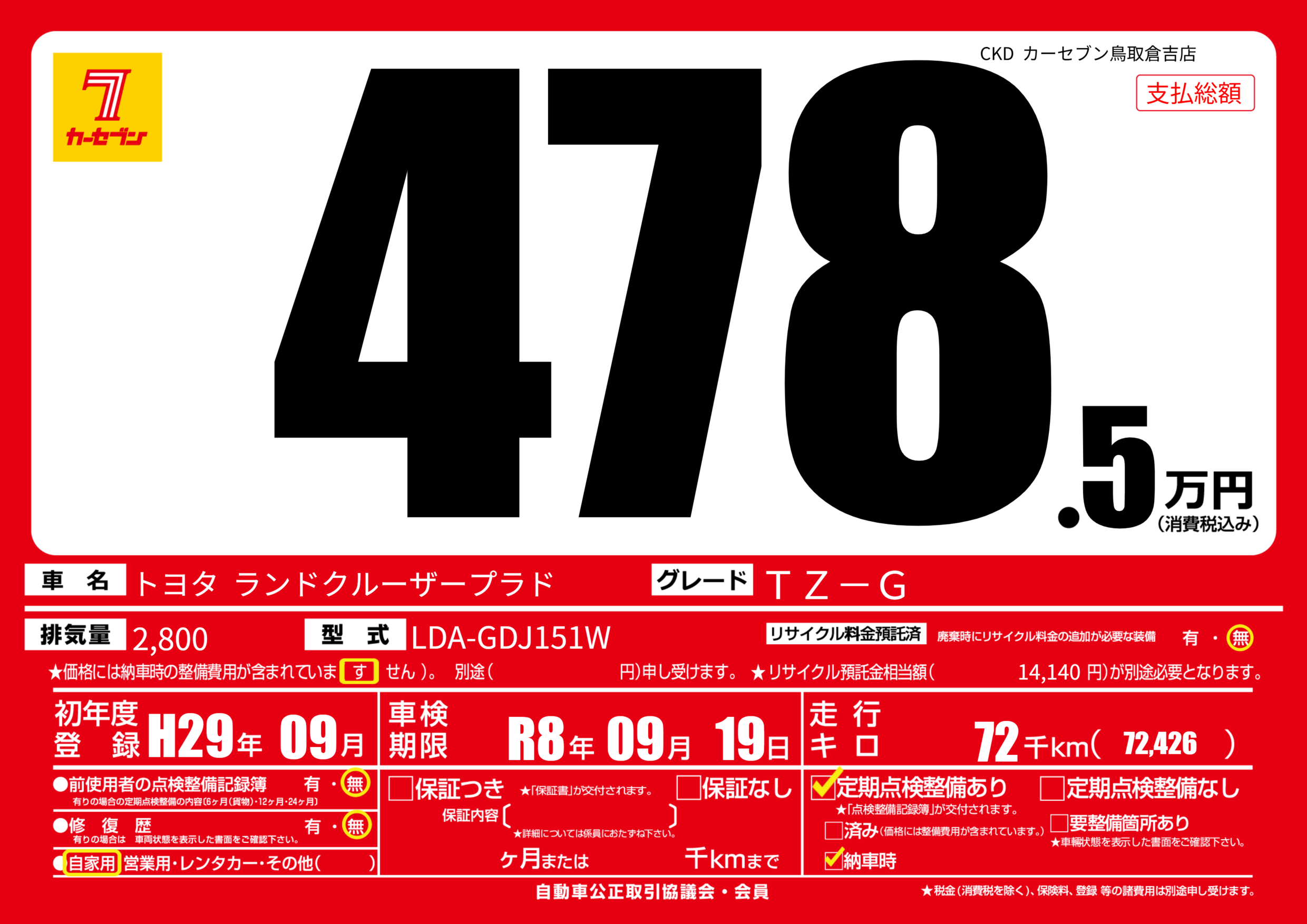 | 車名 | トヨタ ランドクルーザープラド | グレード ミッション 排気量 |