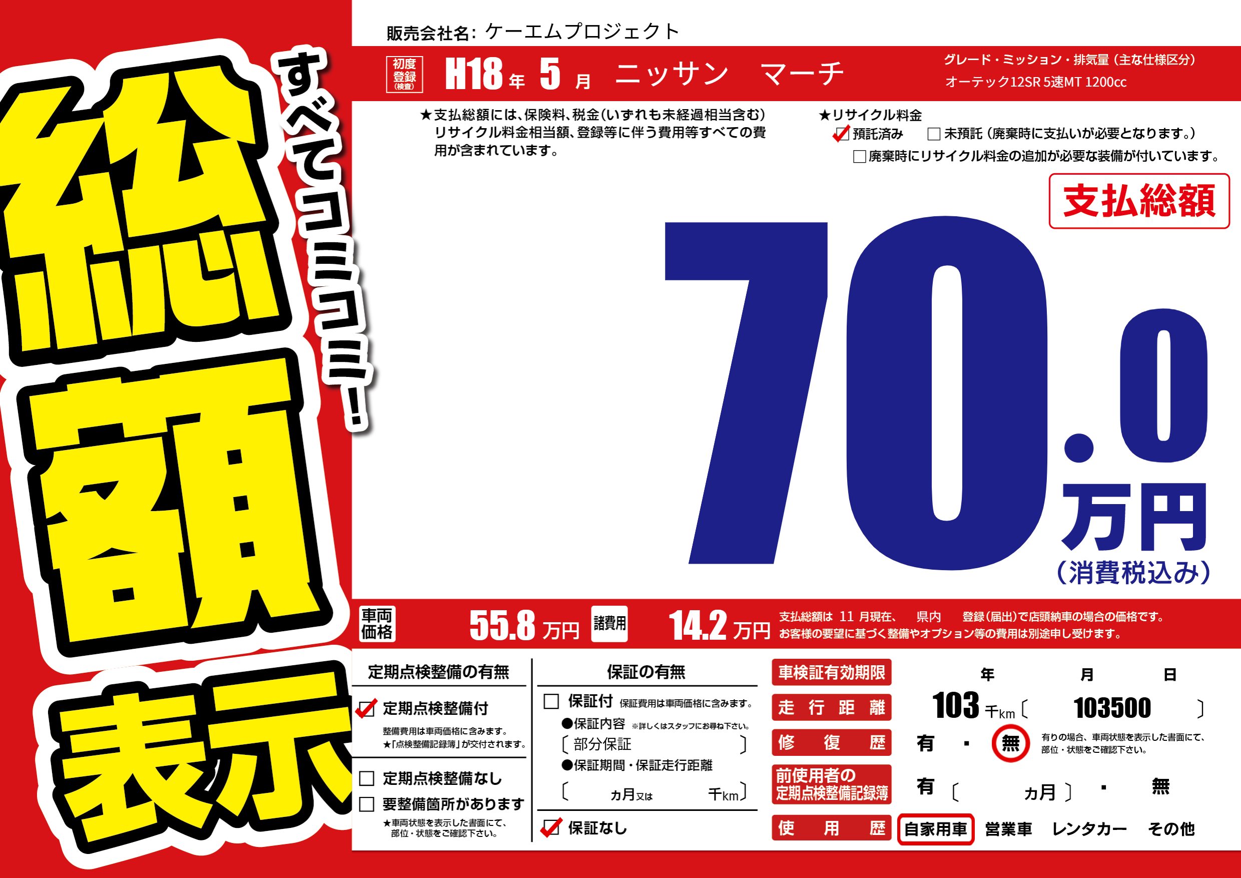 | 車名 | ニッサン マーチ | グレード ミッション 排気量 |
