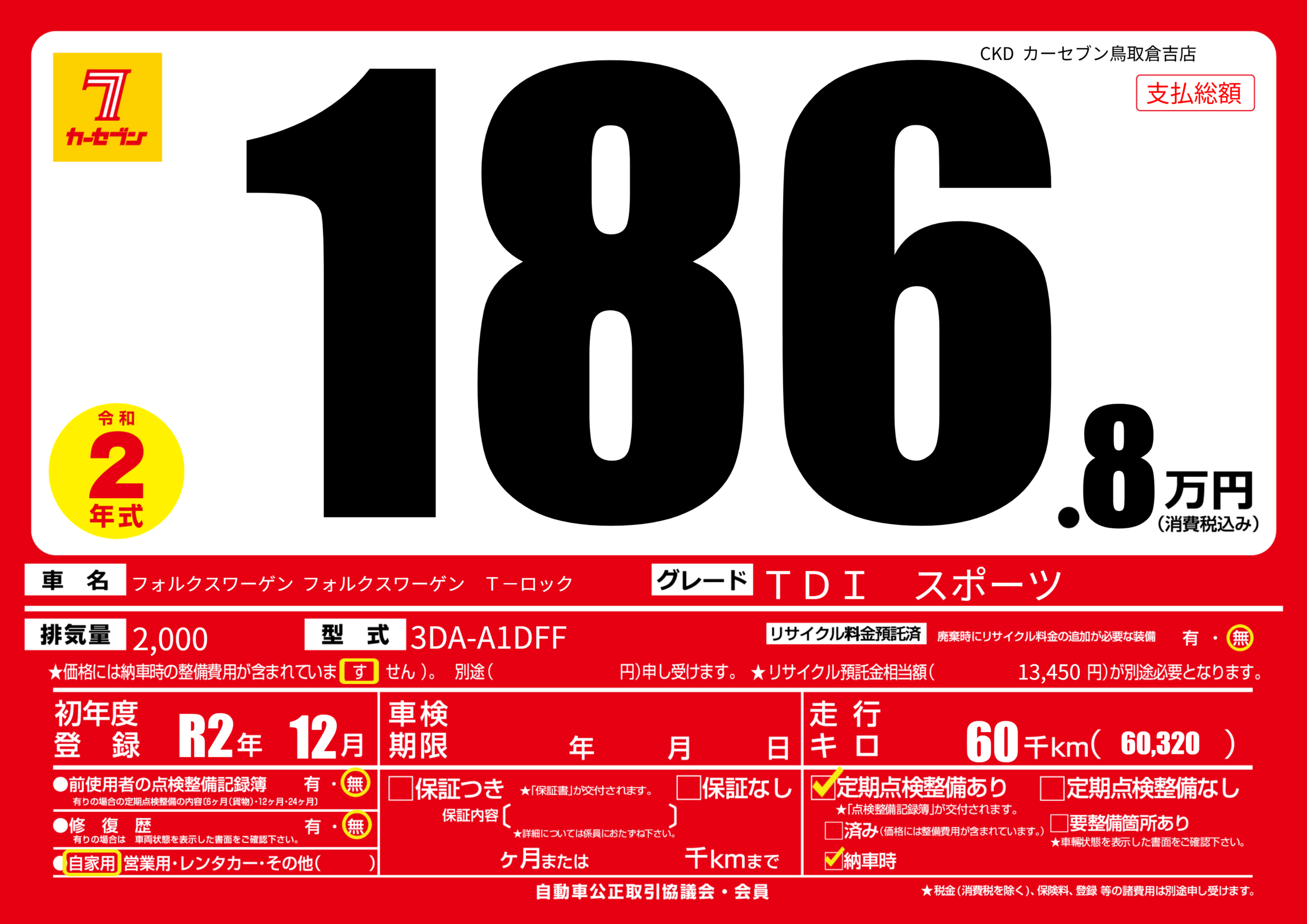 | 走行キロ | 6万km | 初年度登録 | R2年12月 |