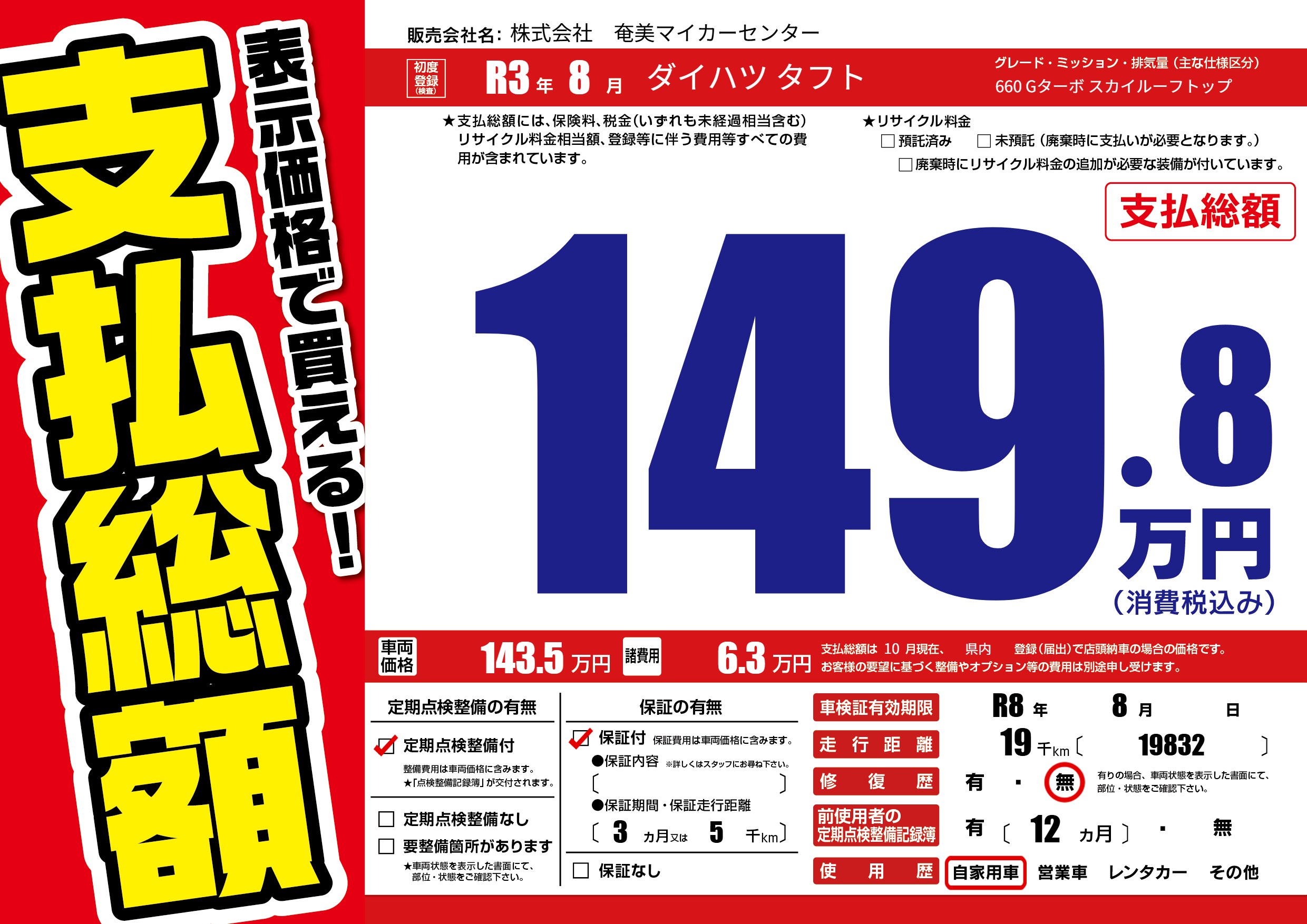 | 走行キロ | 1.9万km | 初年度登録 | R3年8月 |