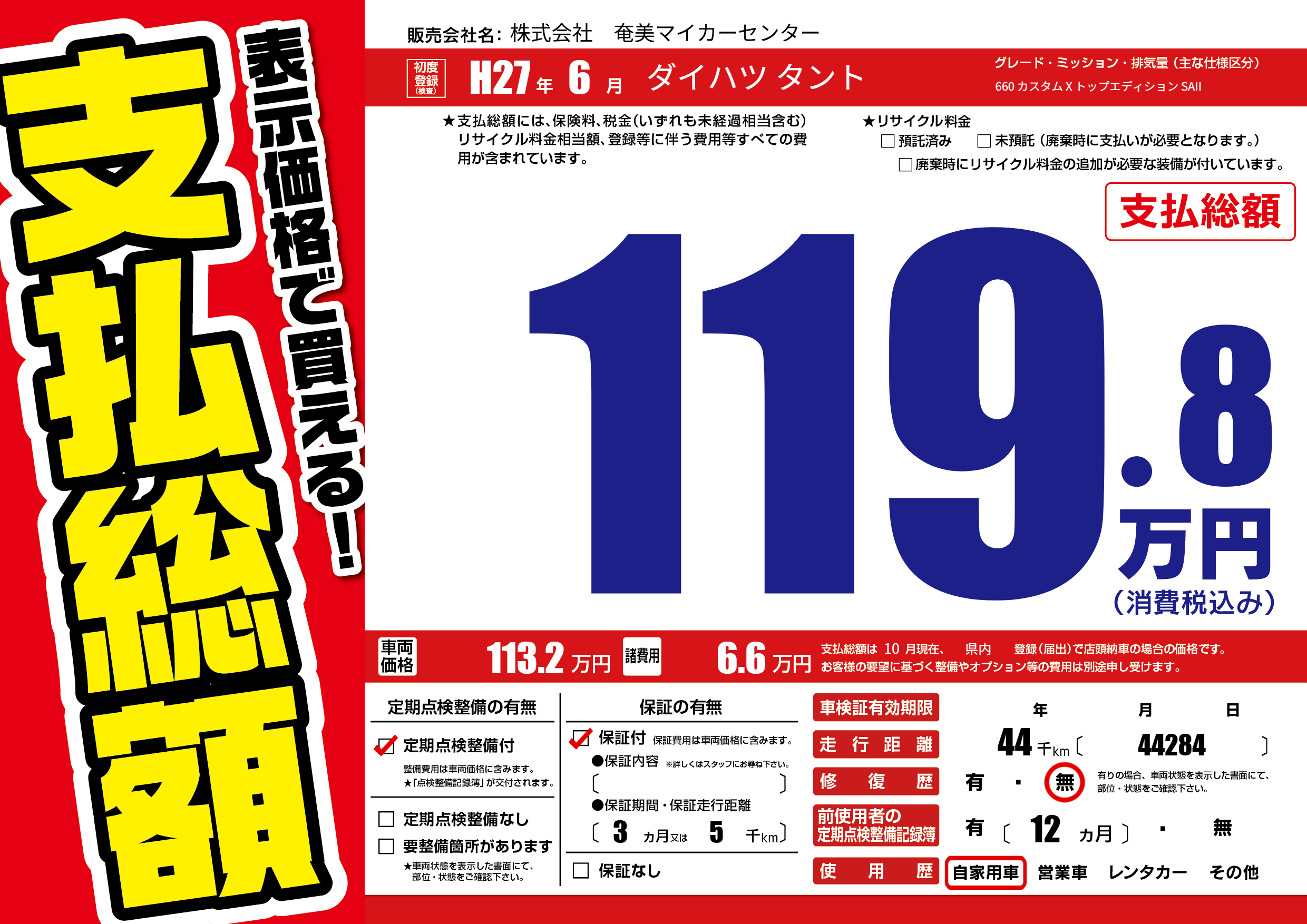 | 走行キロ | 4.4万km | 初年度登録 | H27年6月 |