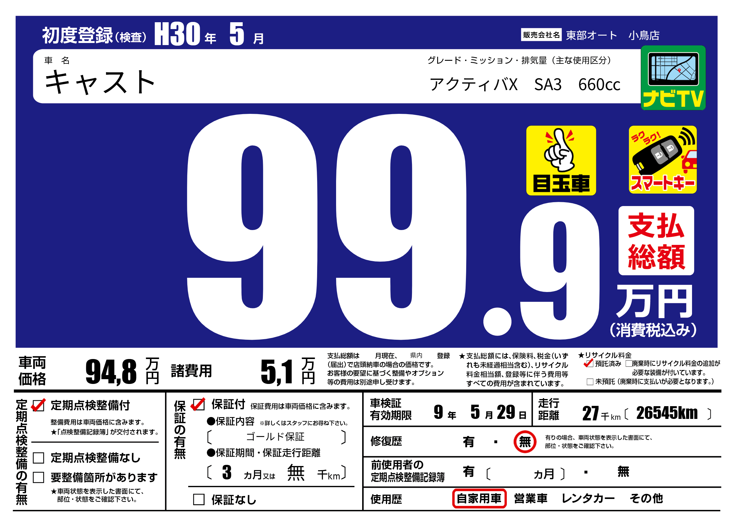 | 走行キロ | 2.7万km | 初年度登録 | H30年5月 |