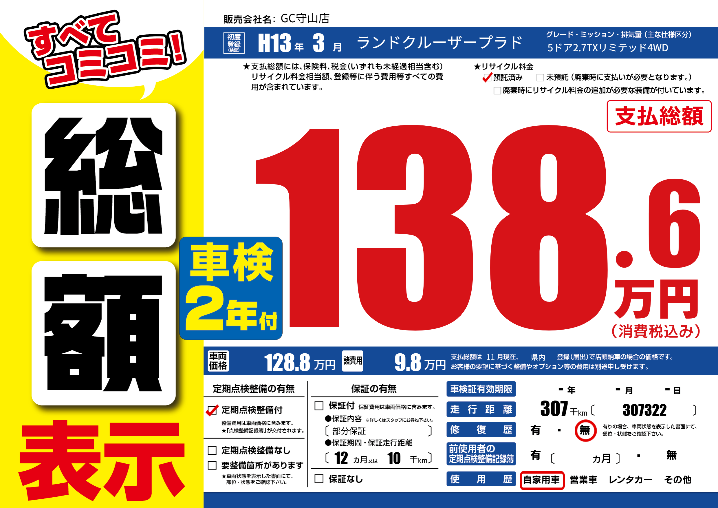 | 走行キロ | 30.7万km | 初年度登録 | H13年3月 |