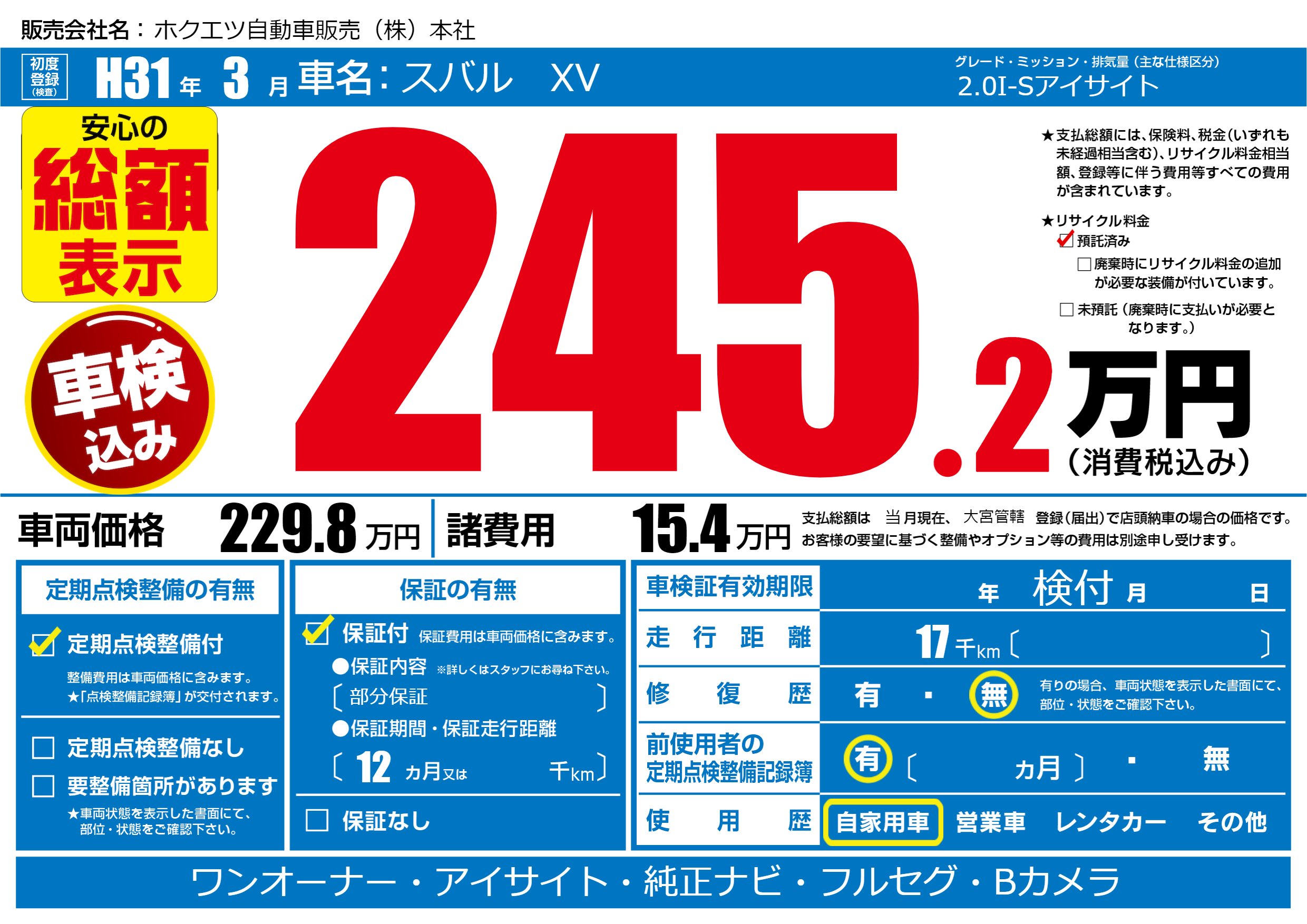 | 車名 | スバル XV | グレード ミッション 排気量 |