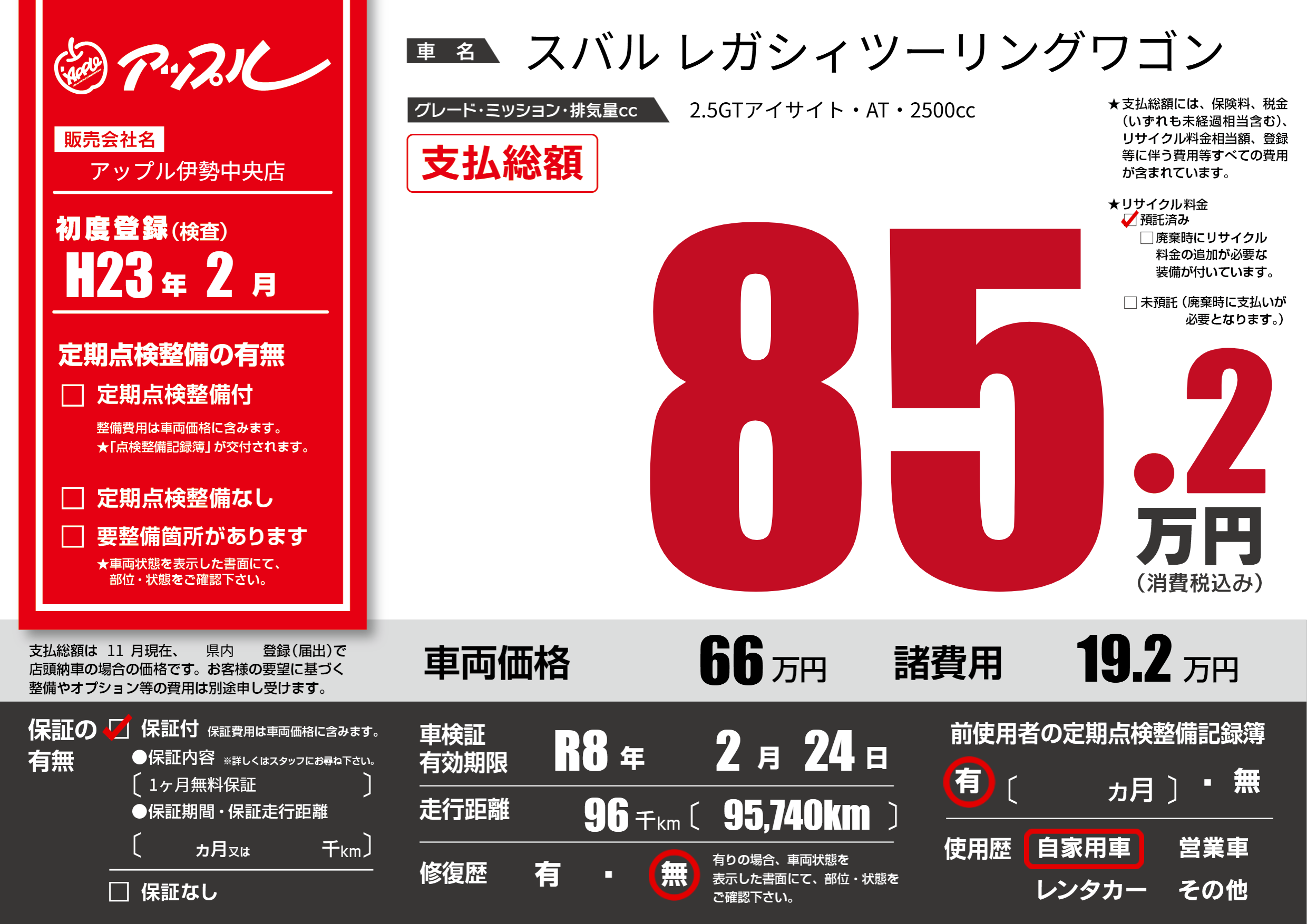 | 車名 | スバル レガシィツーリングワゴン | グレード ミッション 排気量 |