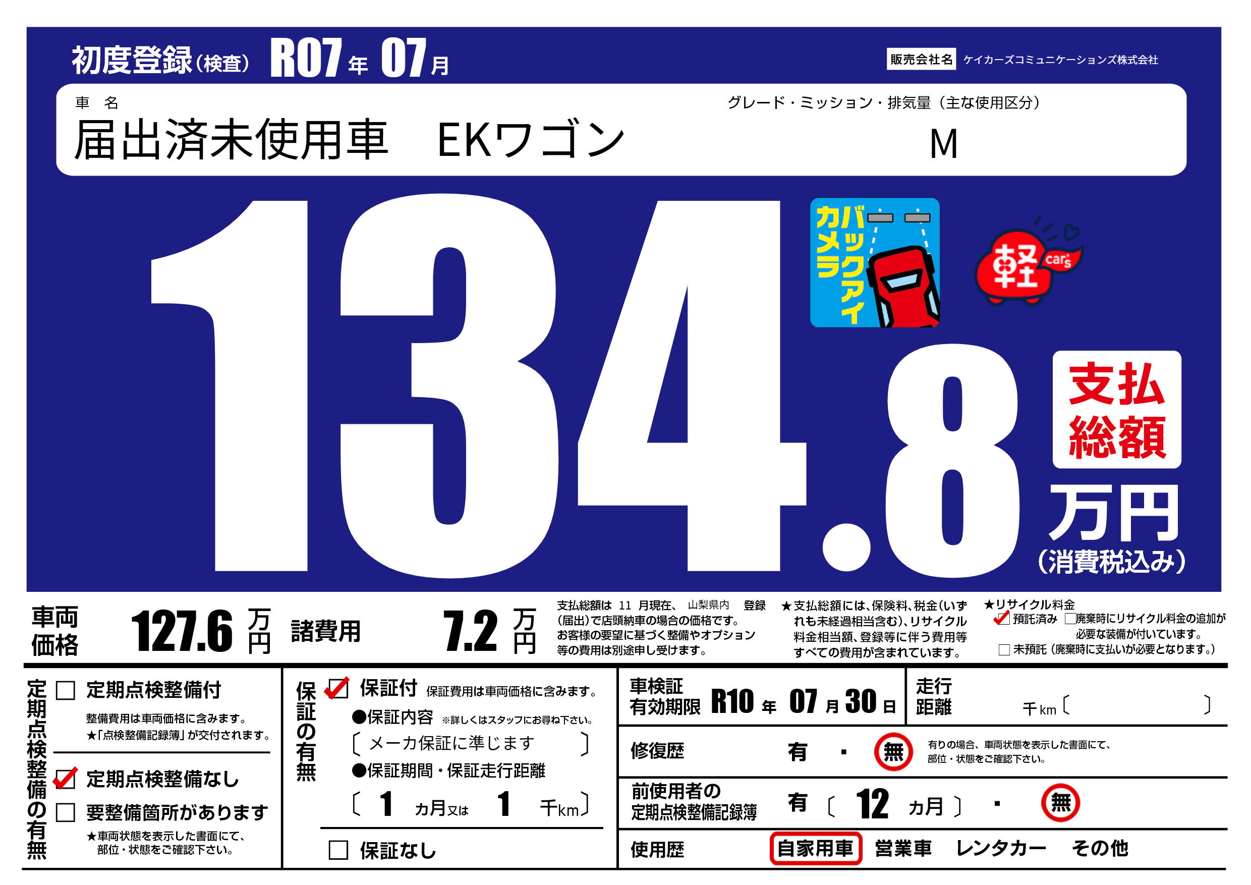| 走行キロ | - | 初年度登録 | R07年07月 |