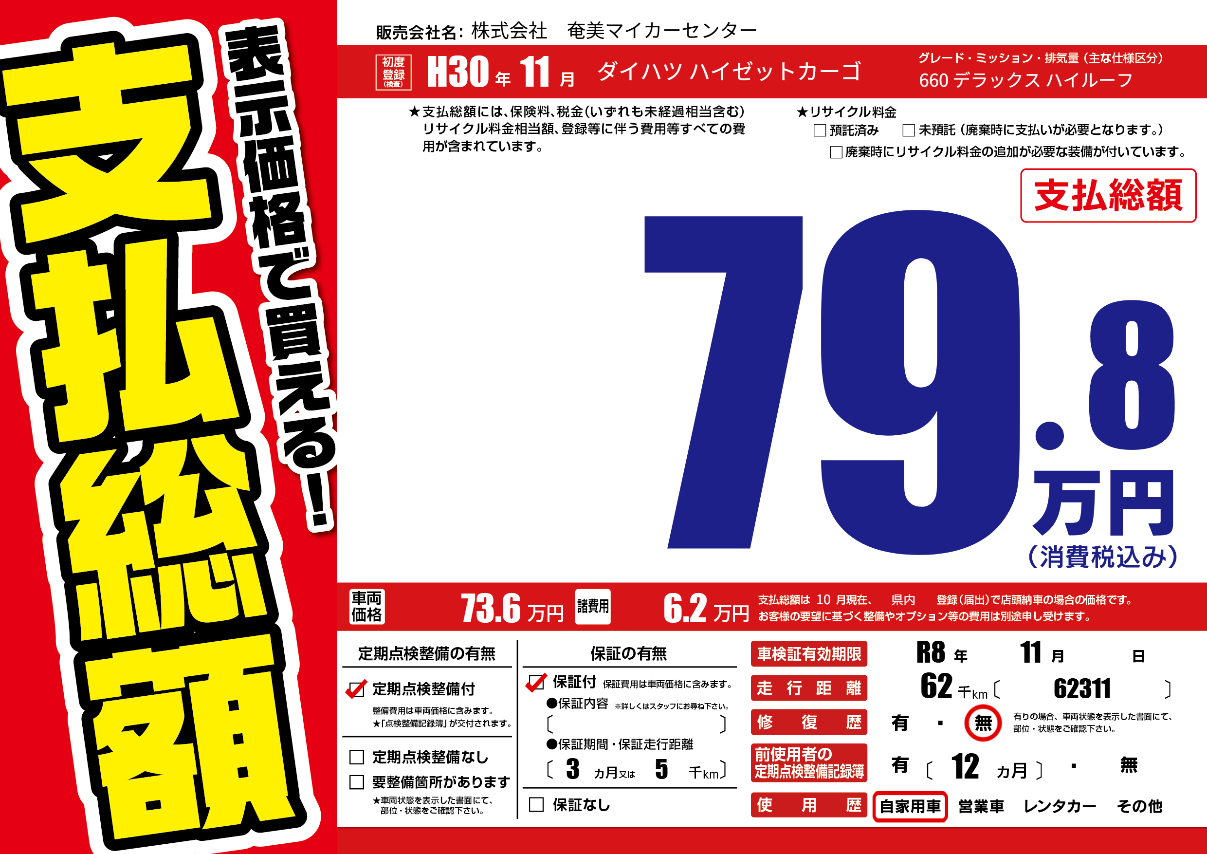 | 走行キロ | 6.2万km | 初年度登録 | H30年11月 |