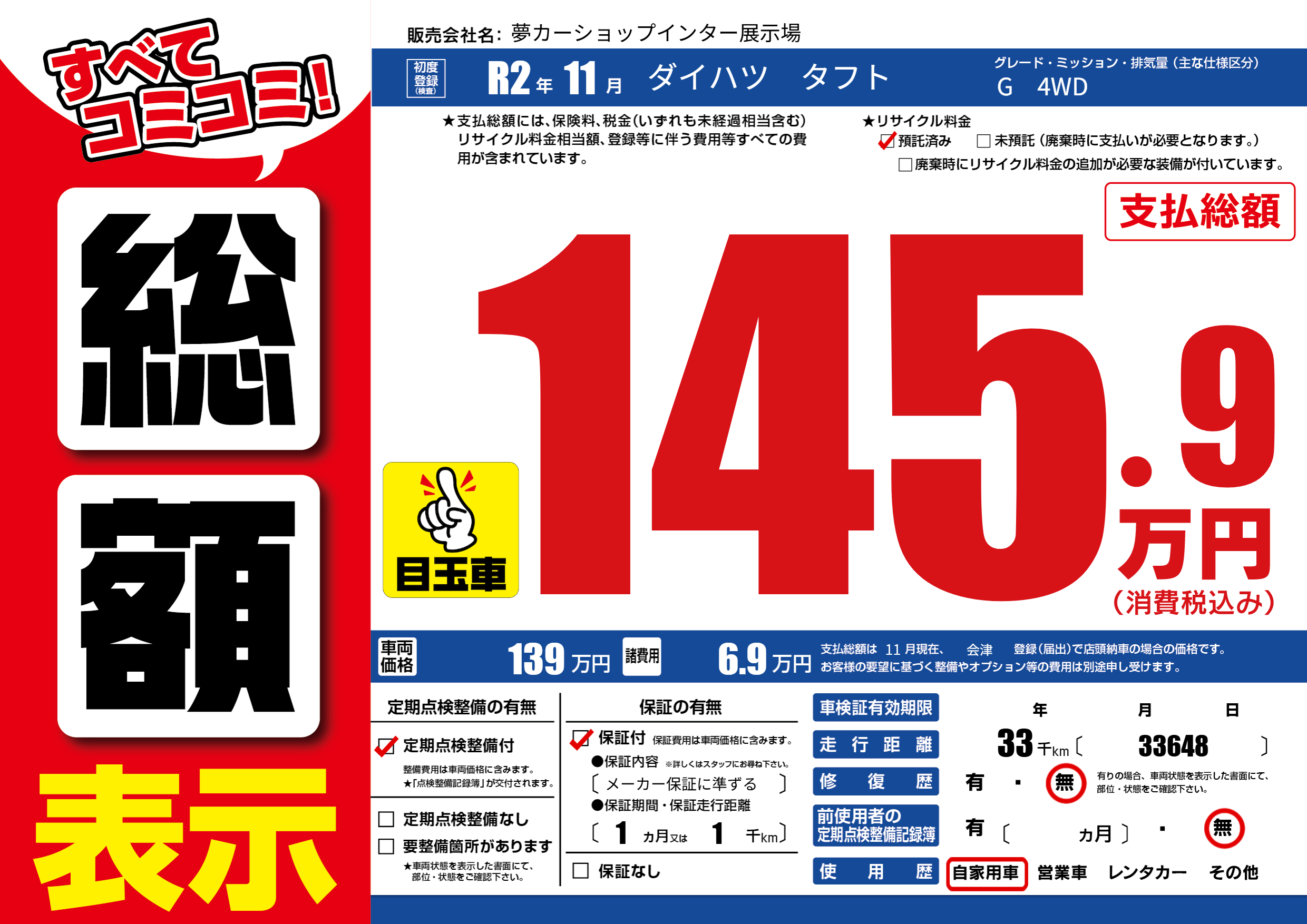 | 走行キロ | 3.3万km | 初年度登録 | R2年11月 |