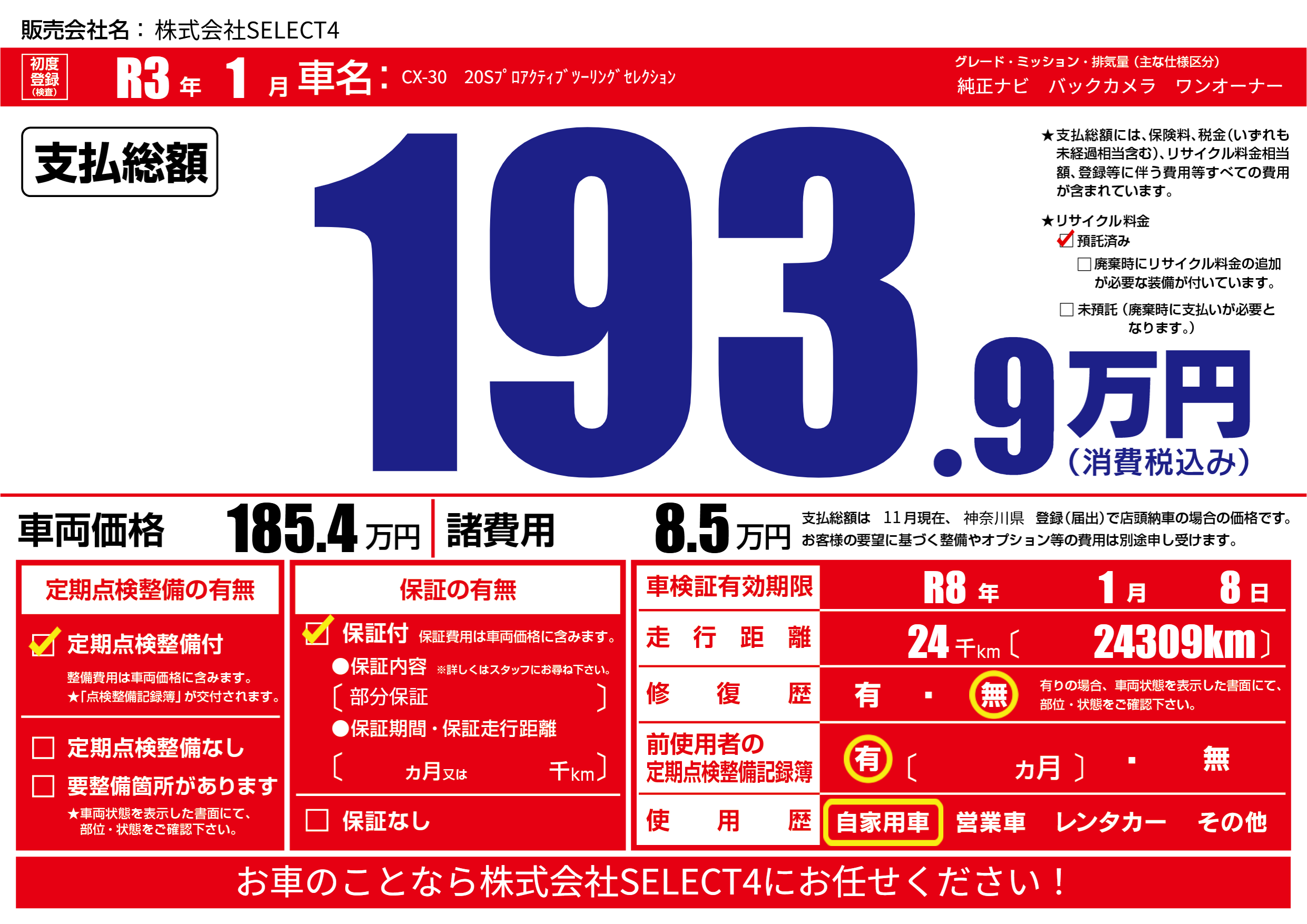 | 車名 | CX-30 20Sプロアクティブツーリングセレクション | グレード ミッション 排気量 |
