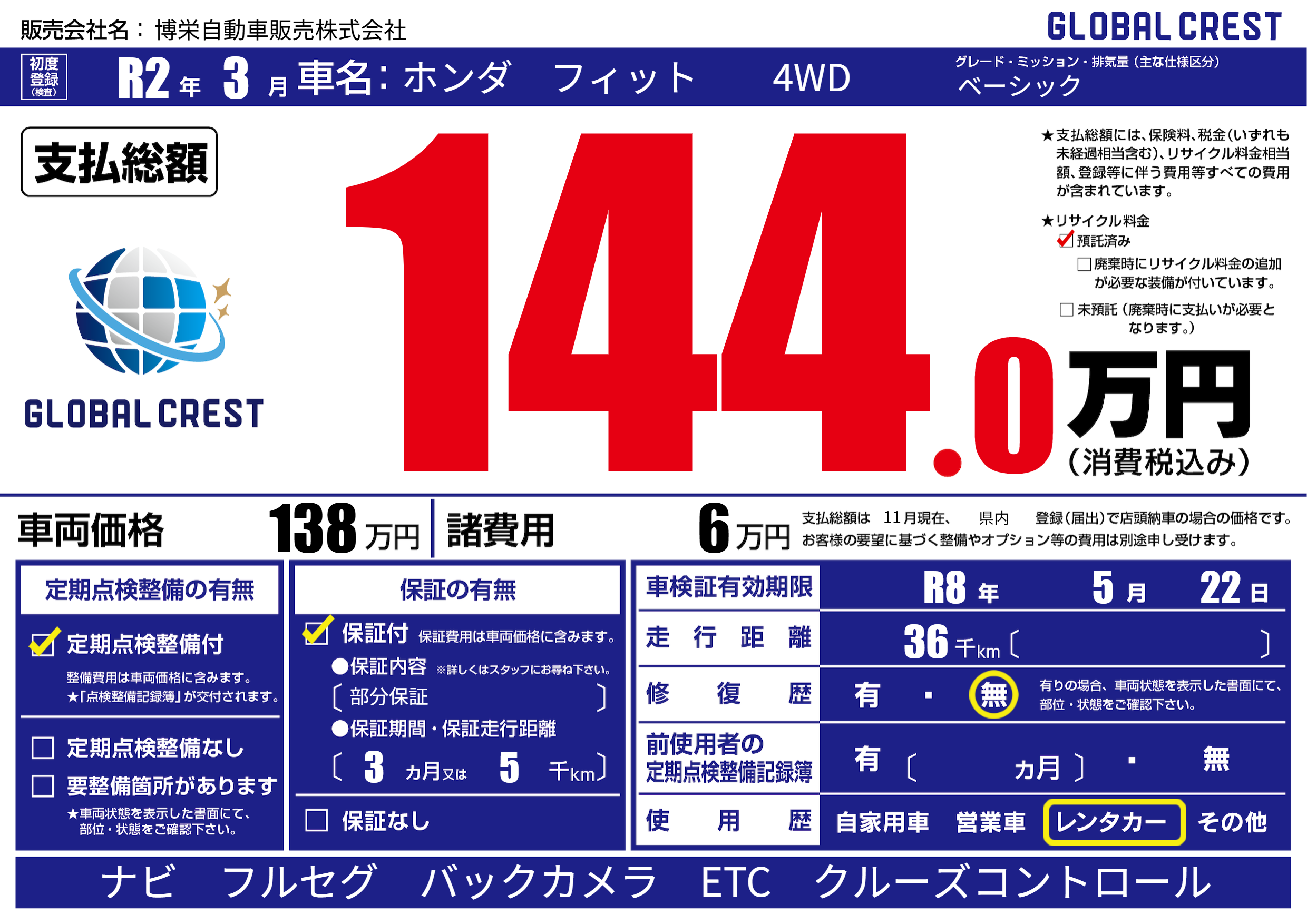 | 車名 | ホンダ フィット 4WD | グレード ミッション 排気量 |