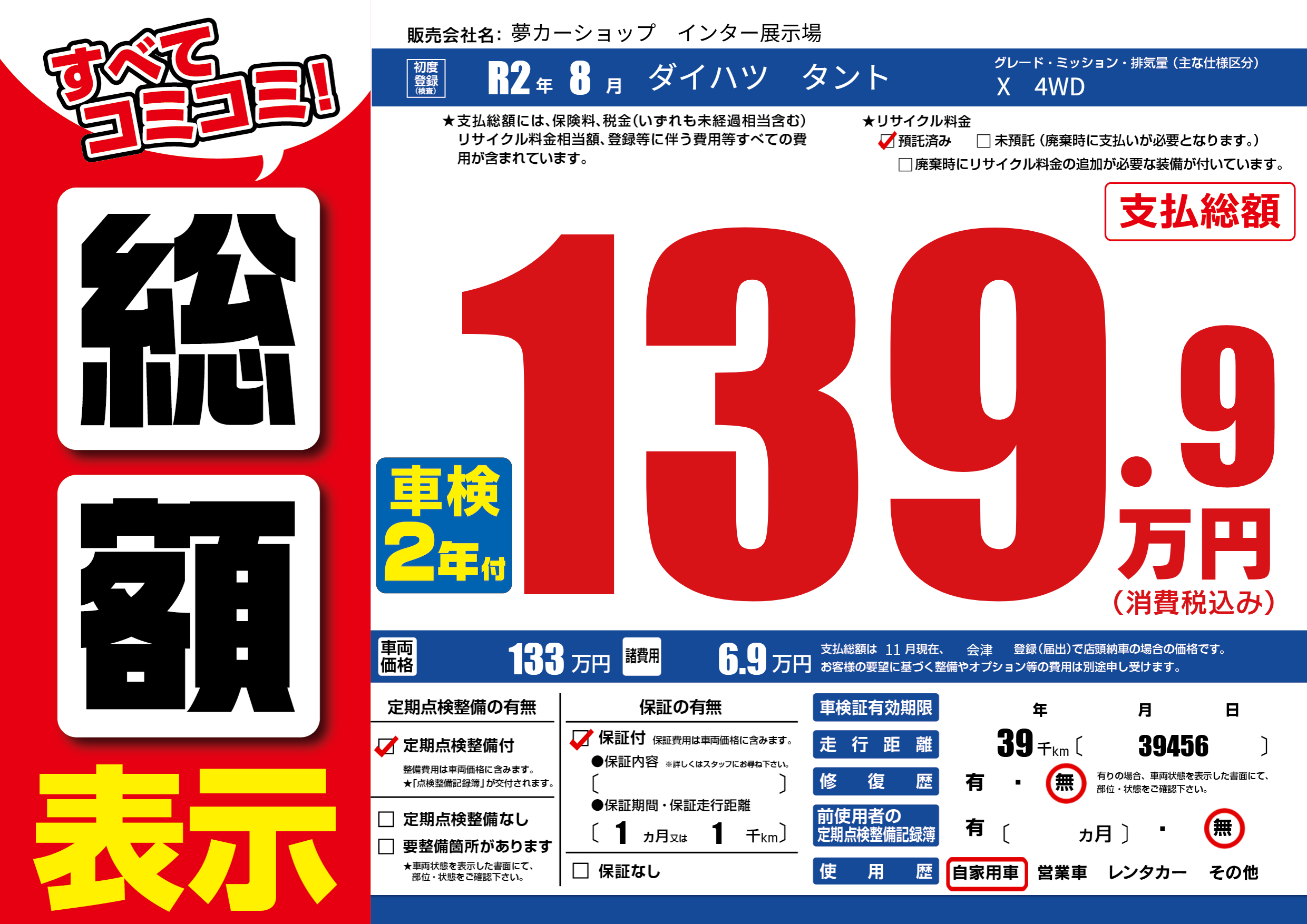| 車名 | ダイハツ タント | グレード ミッション 排気量 |