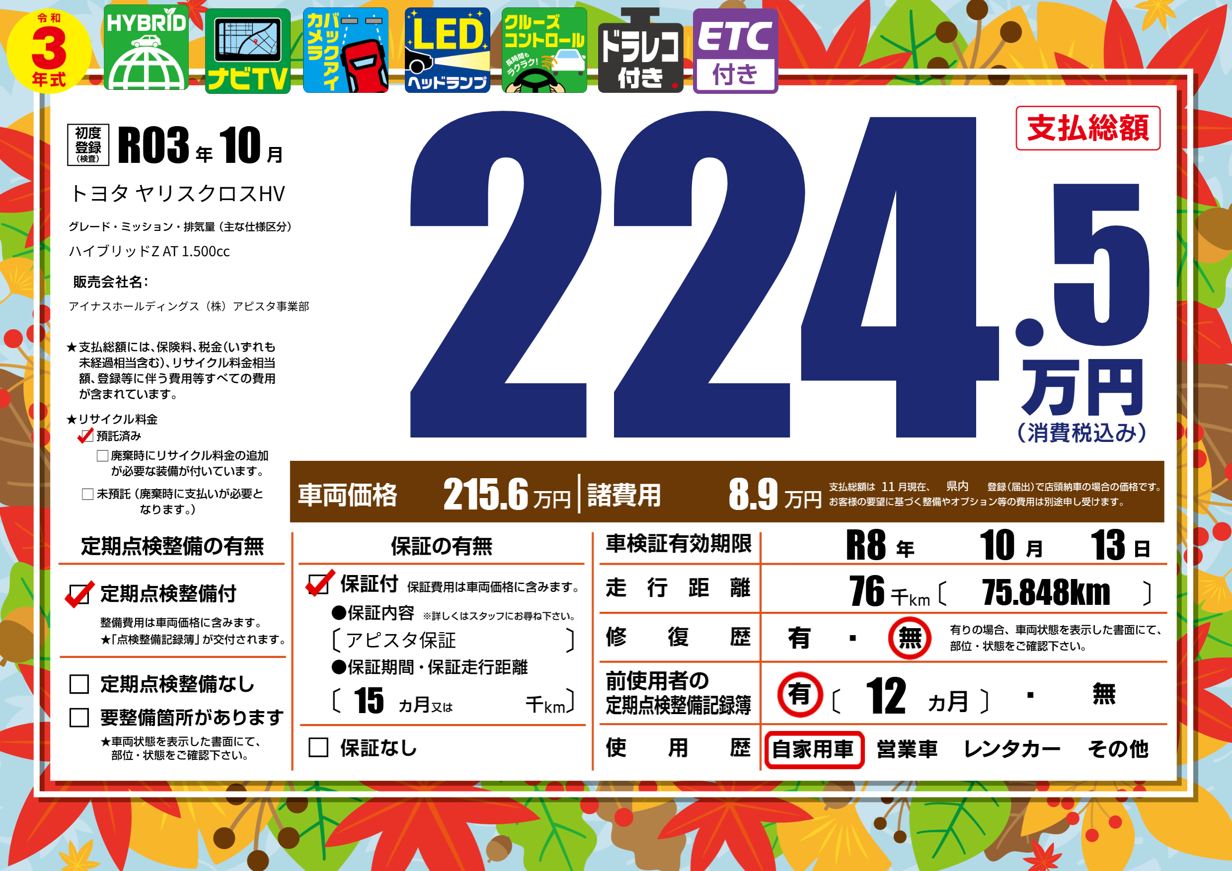 | 走行キロ | 7.6万km | 初年度登録 | R03年10月 |