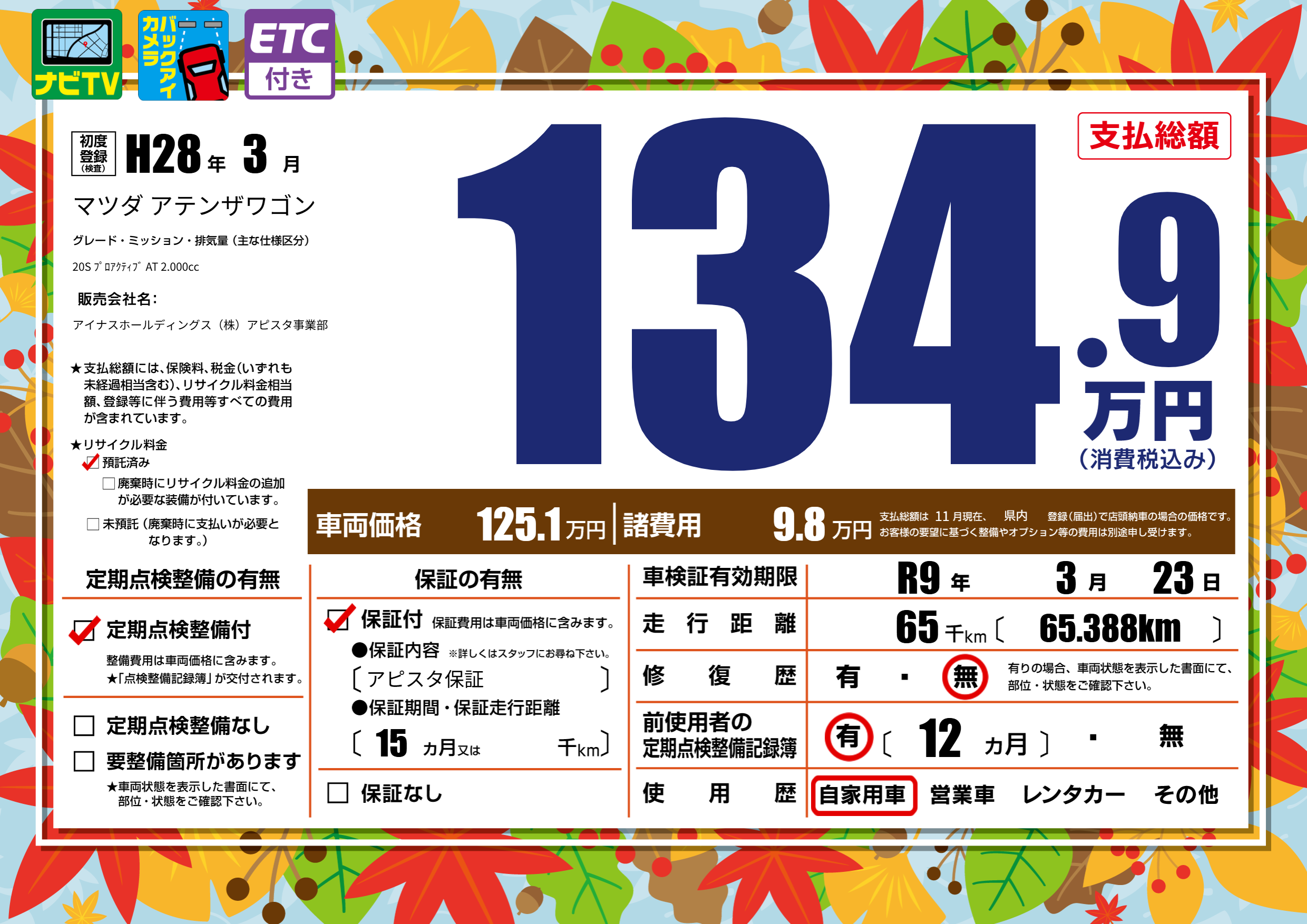 | 走行キロ | 6.5万km | 初年度登録 | H28年3月 |