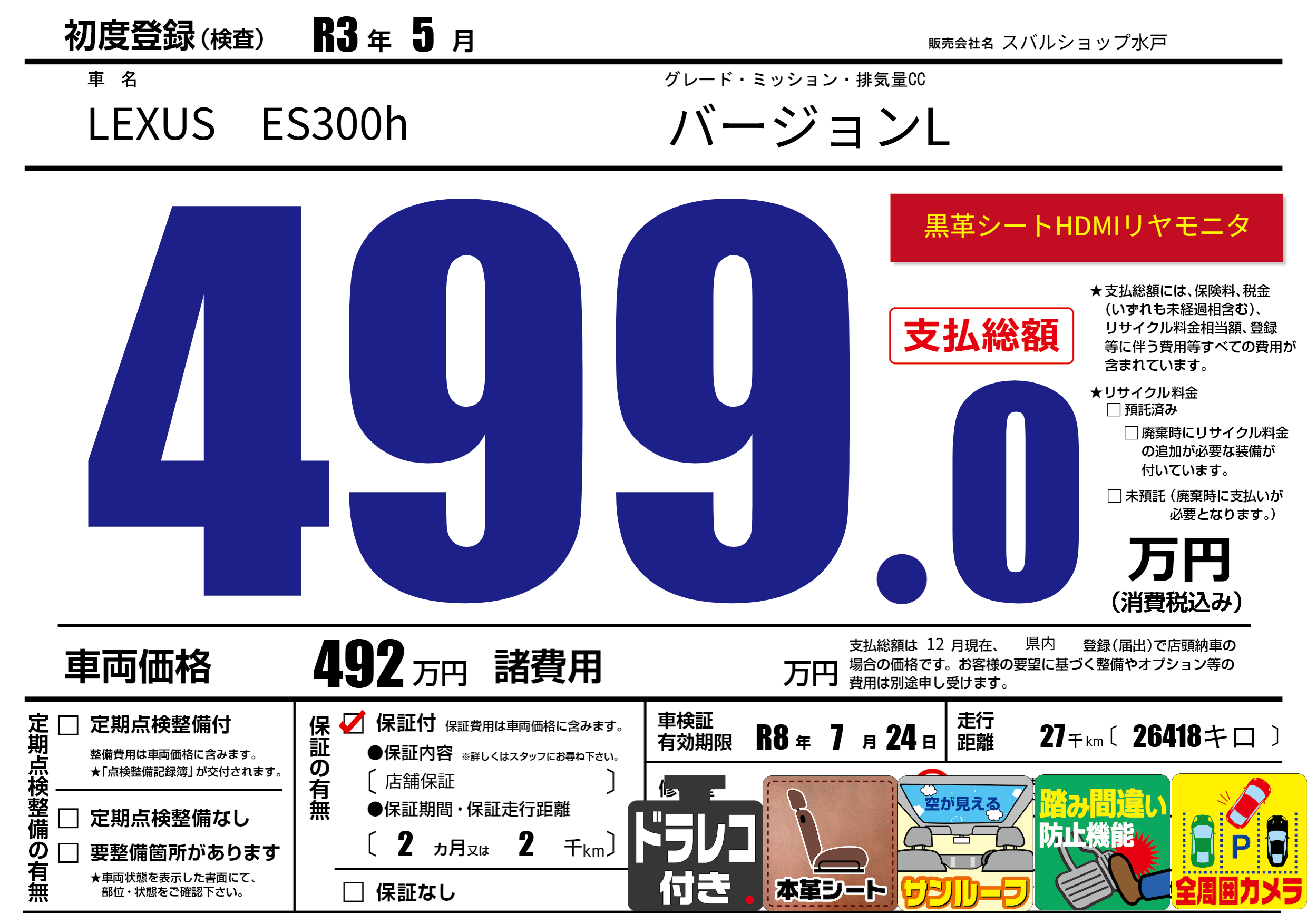 | 車名 | LEXUS ES300h | グレード ミッション 排気量 |