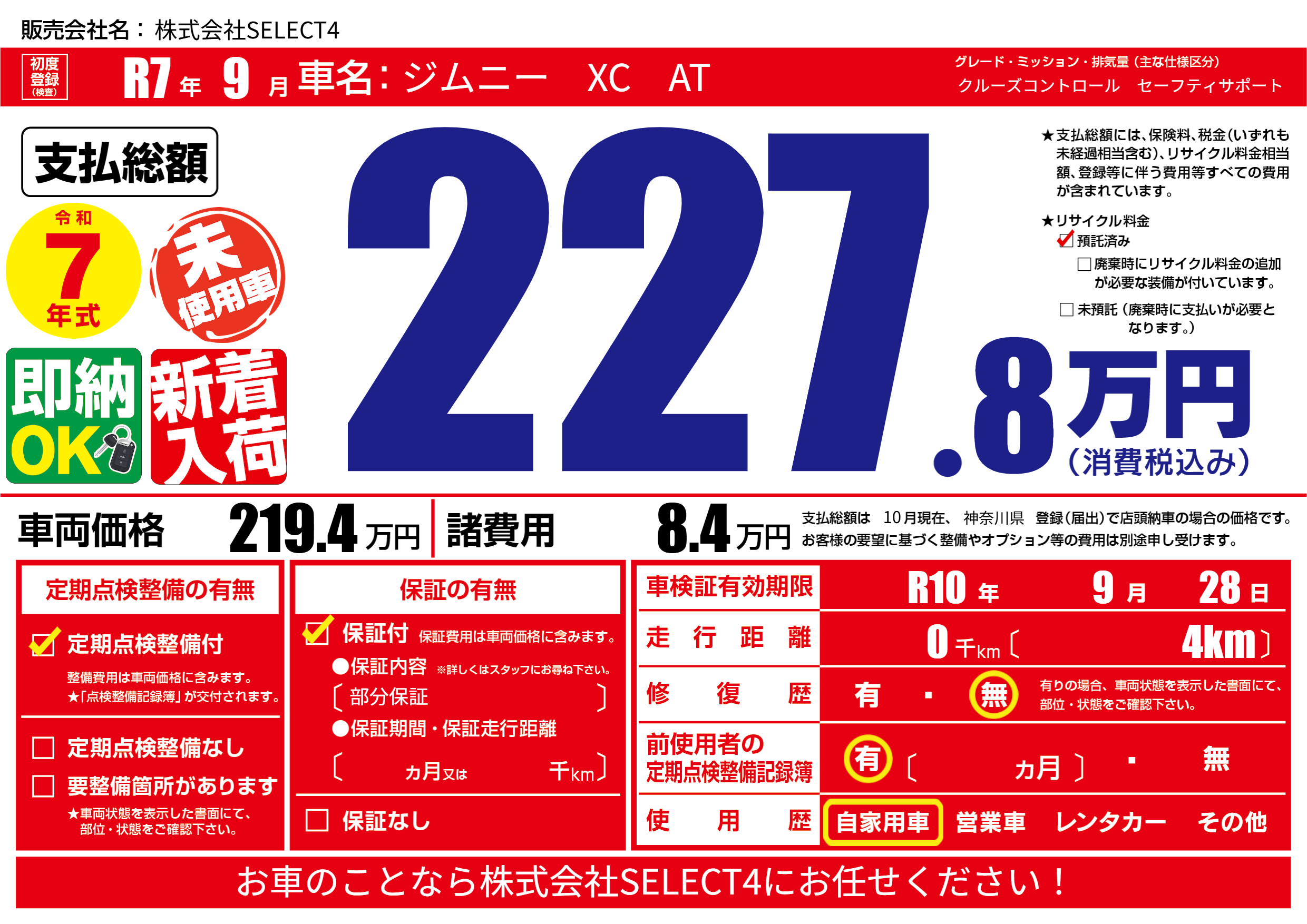 | 走行キロ | - | 初年度登録 | R7年9月 |