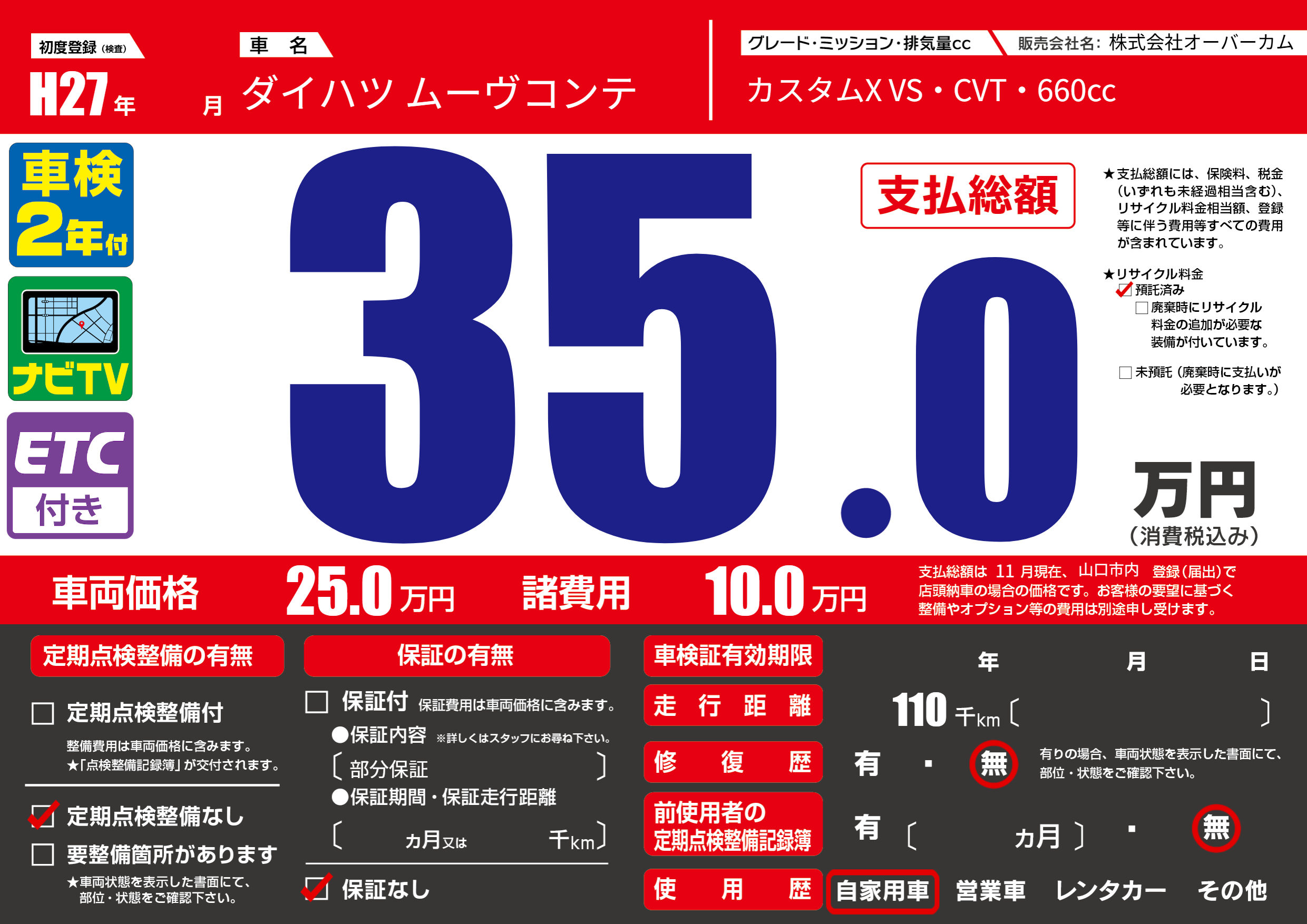 | 車名 | ダイハツ ムーヴコンテ | グレード ミッション 排気量 |