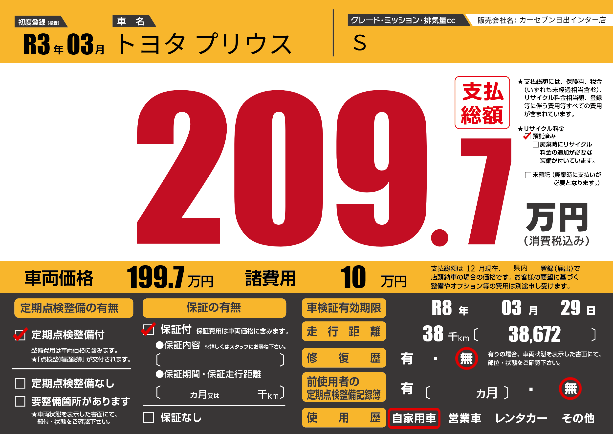 | 車名 | トヨタ プリウス | グレード ミッション 排気量 |