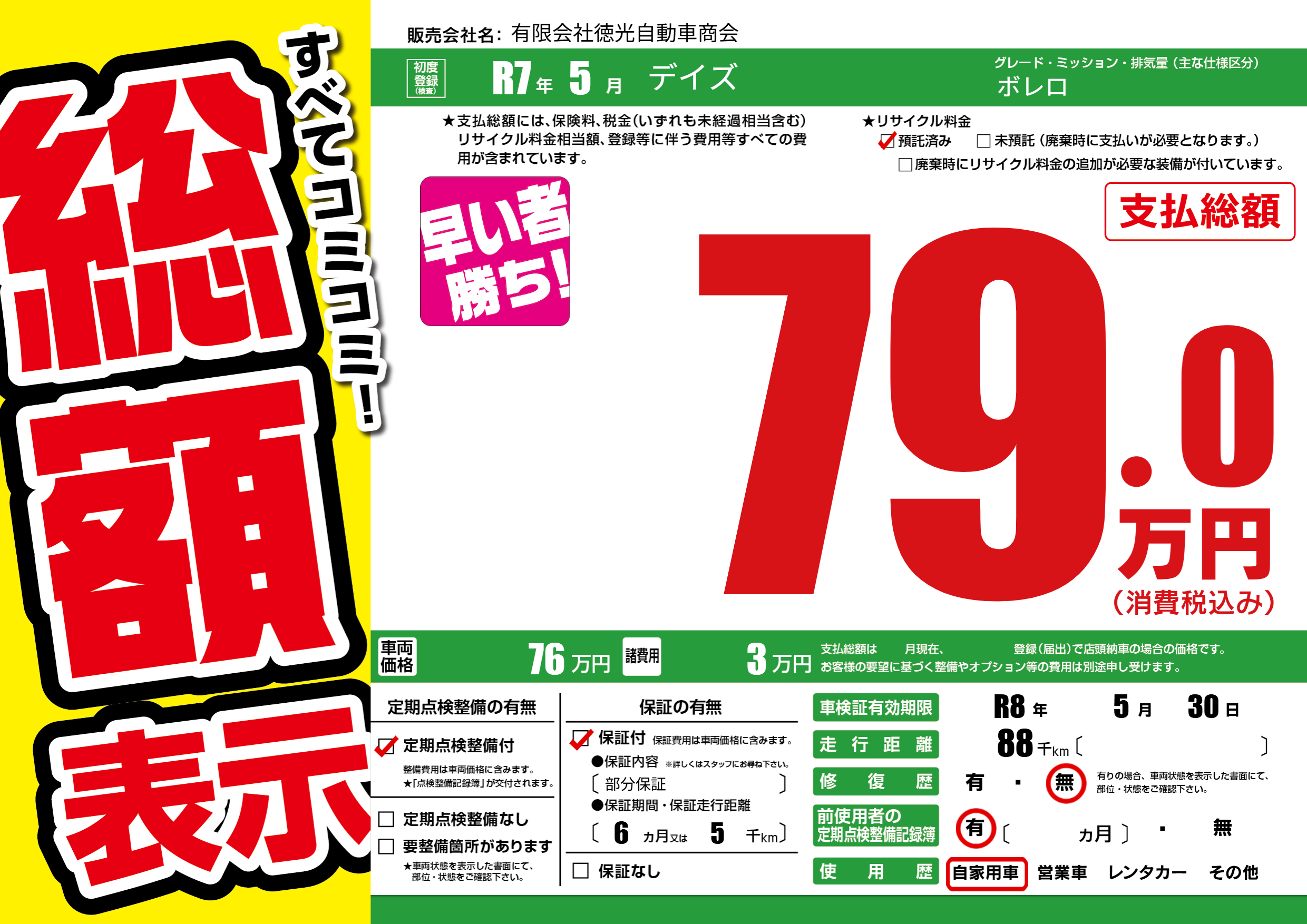 | 車名 | デイズ | グレード ミッション 排気量 |