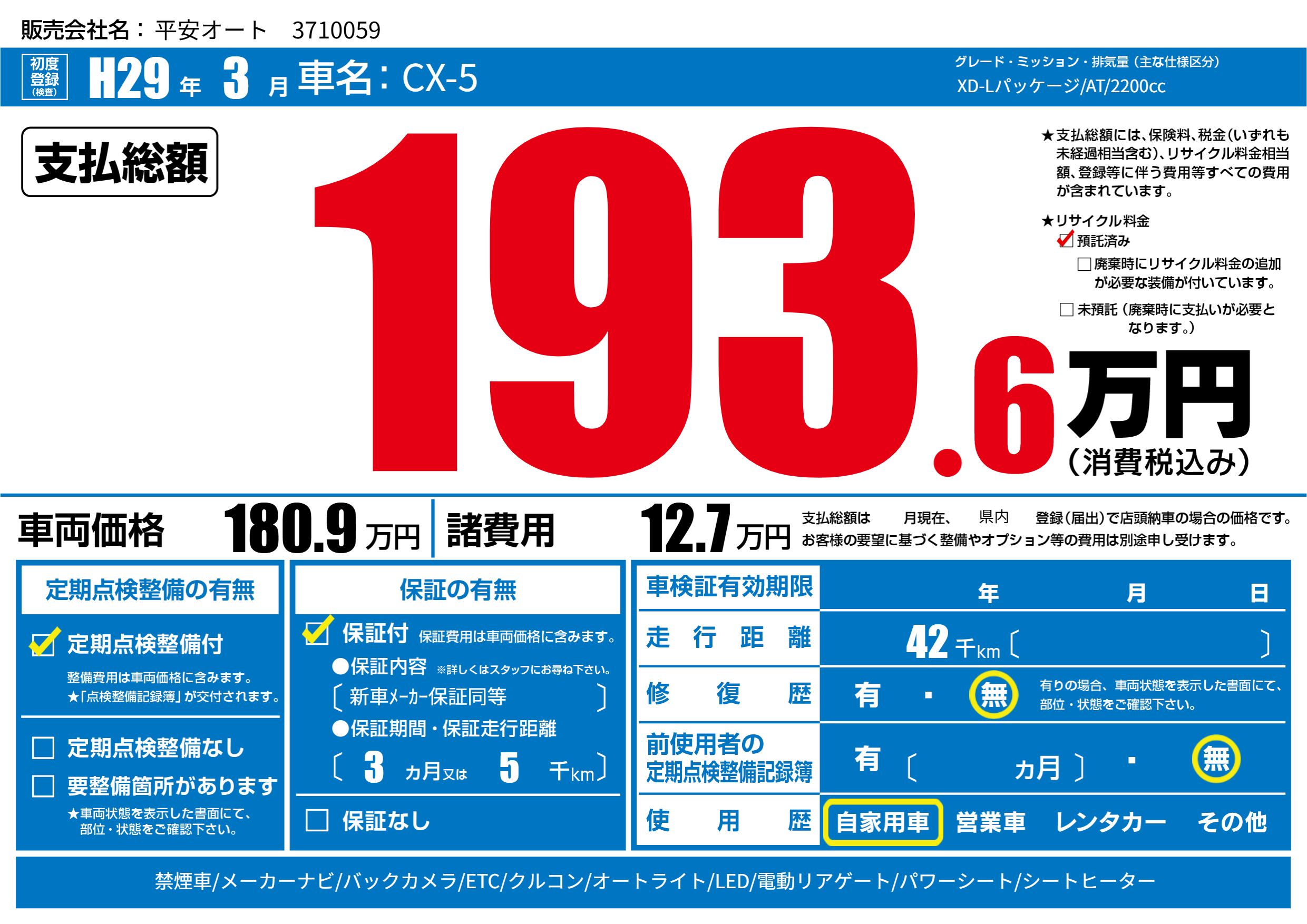 保証付き 保証内容(新車メーカー保証同等) 3ヶ月または(5)千kmまで |