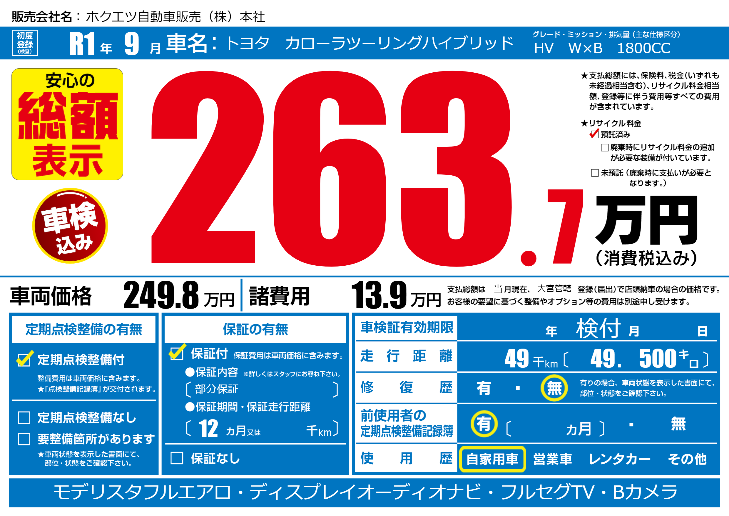 | 車名 | トヨタ カローラツーリングハイブリッド | グレード ミッション 排気量 |
