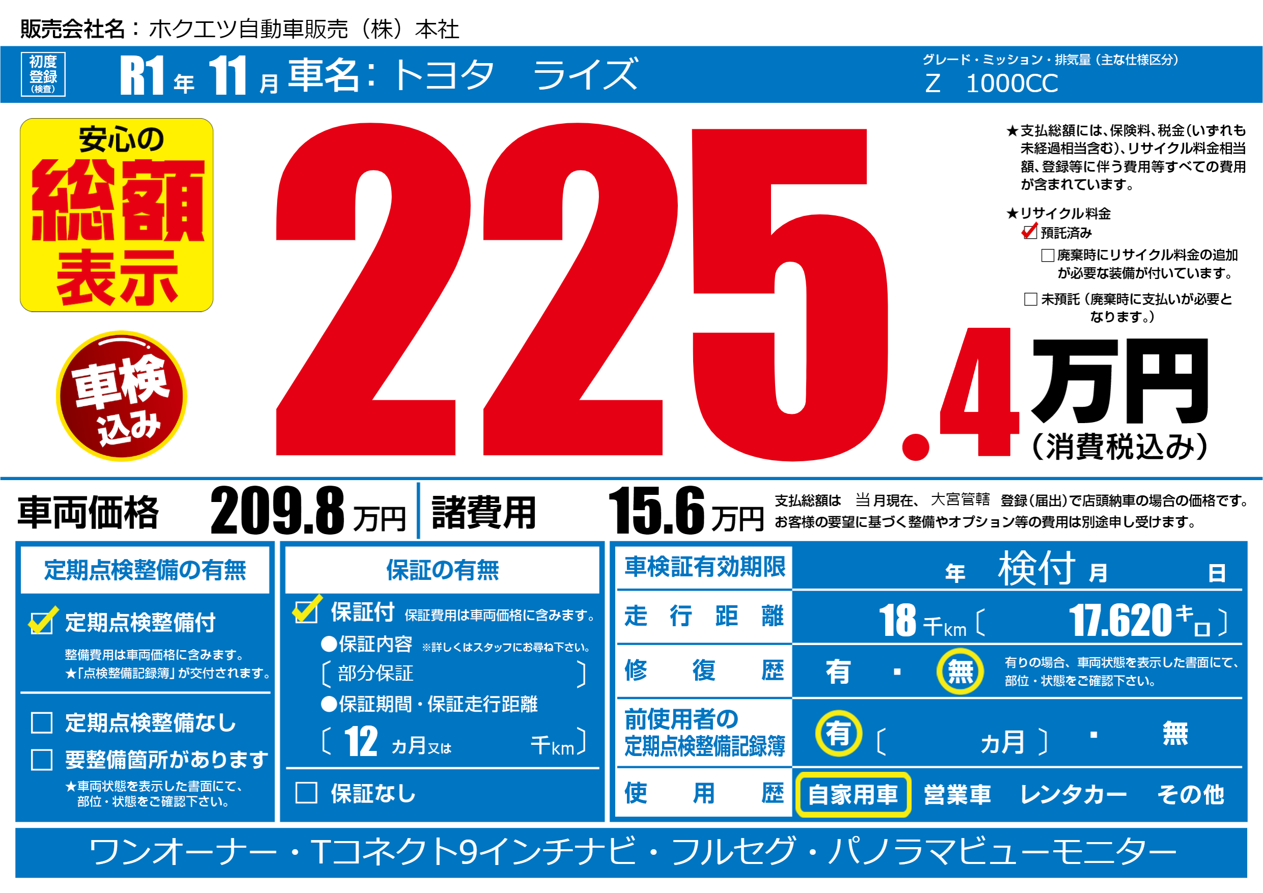 | 車名 | トヨタ ライズ | グレード ミッション 排気量 |