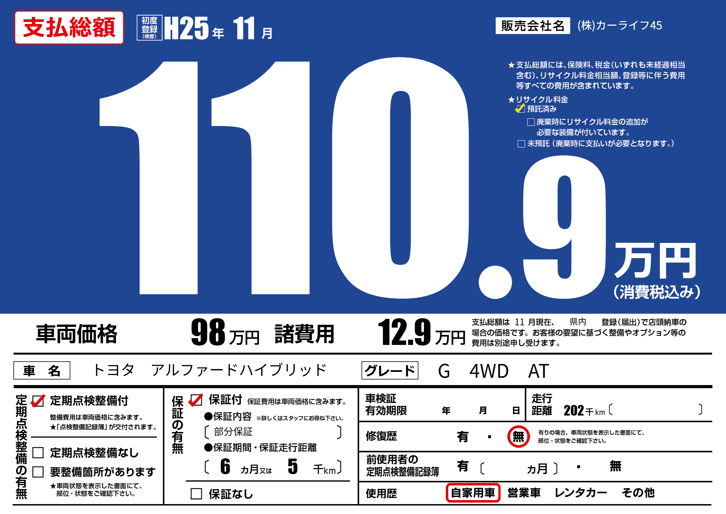 | 車名 | トヨタ アルファードハイブリッド | グレード ミッション 排気量 |