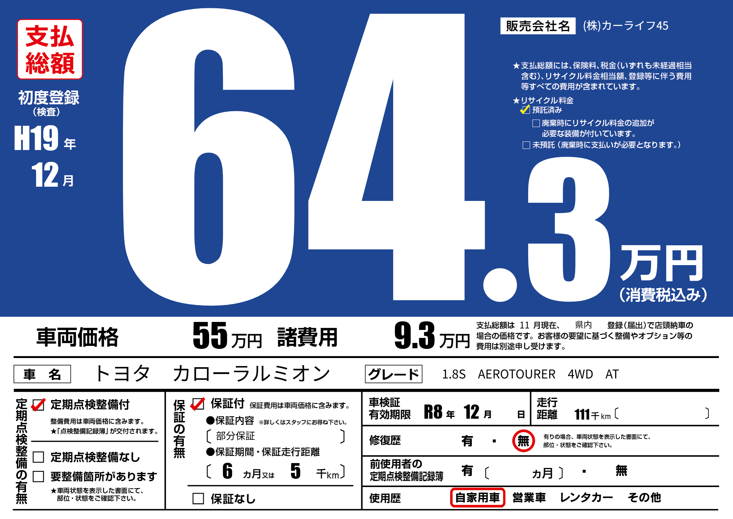 | 車名 | トヨタ カローラルミオン | グレード ミッション 排気量 |