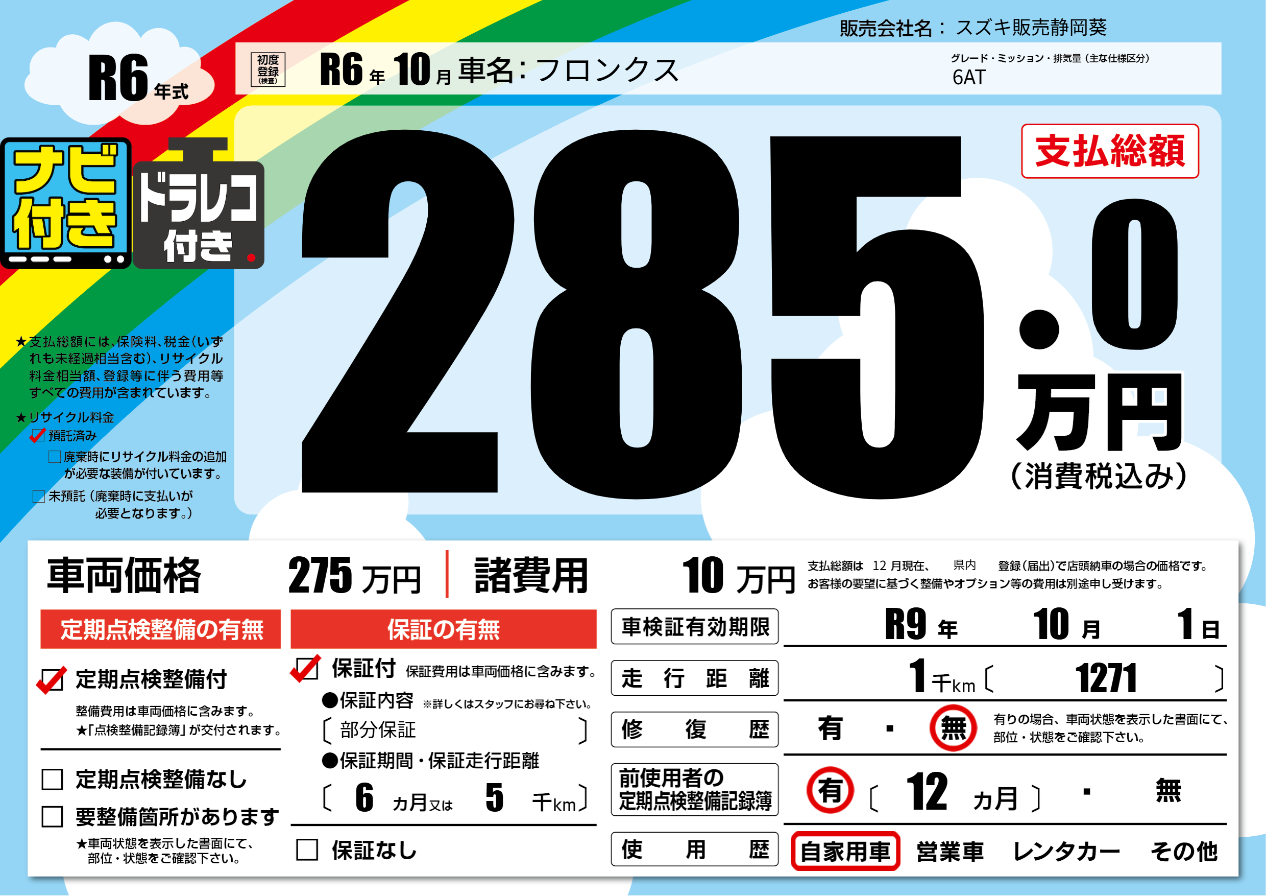 | 走行キロ | 0.1万km | 初年度登録 | R6年10月 |