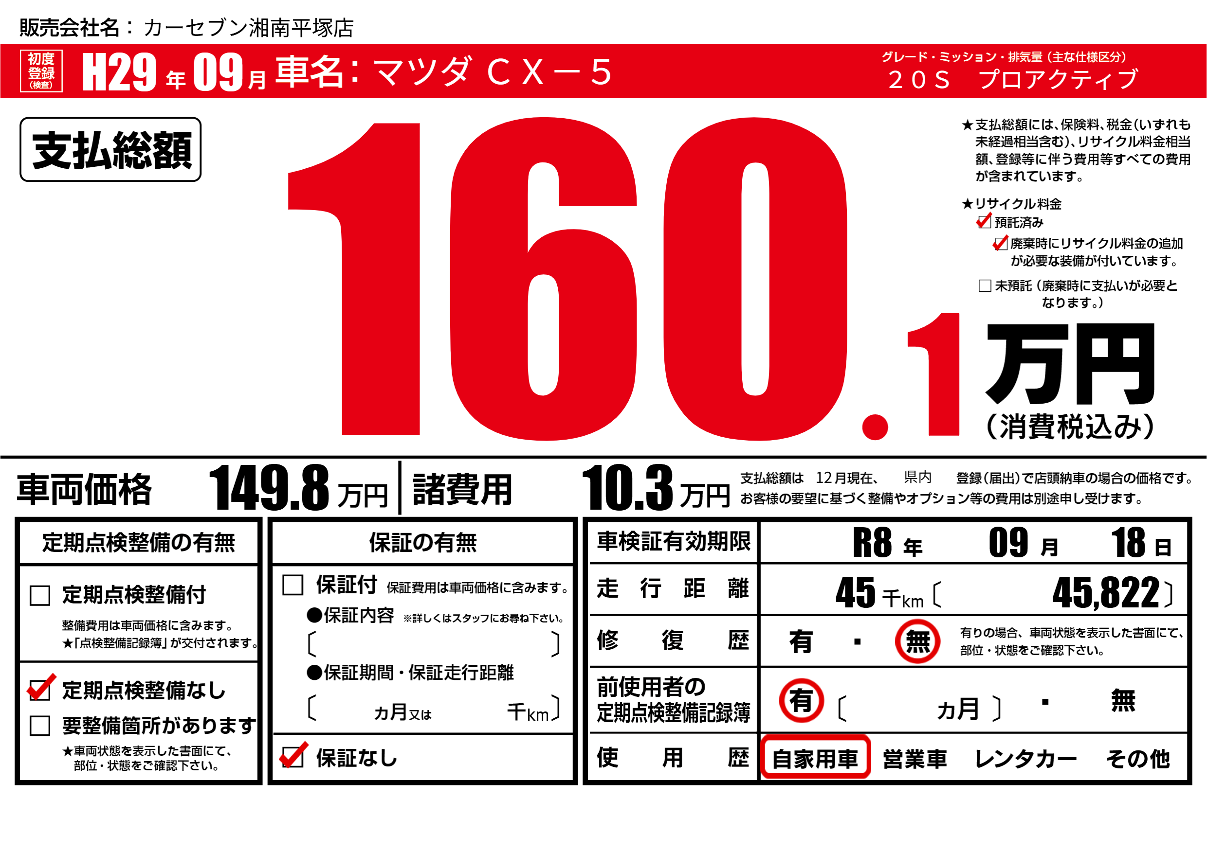 | 車名 | マツダ CX-5 | グレード ミッション 排気量 |