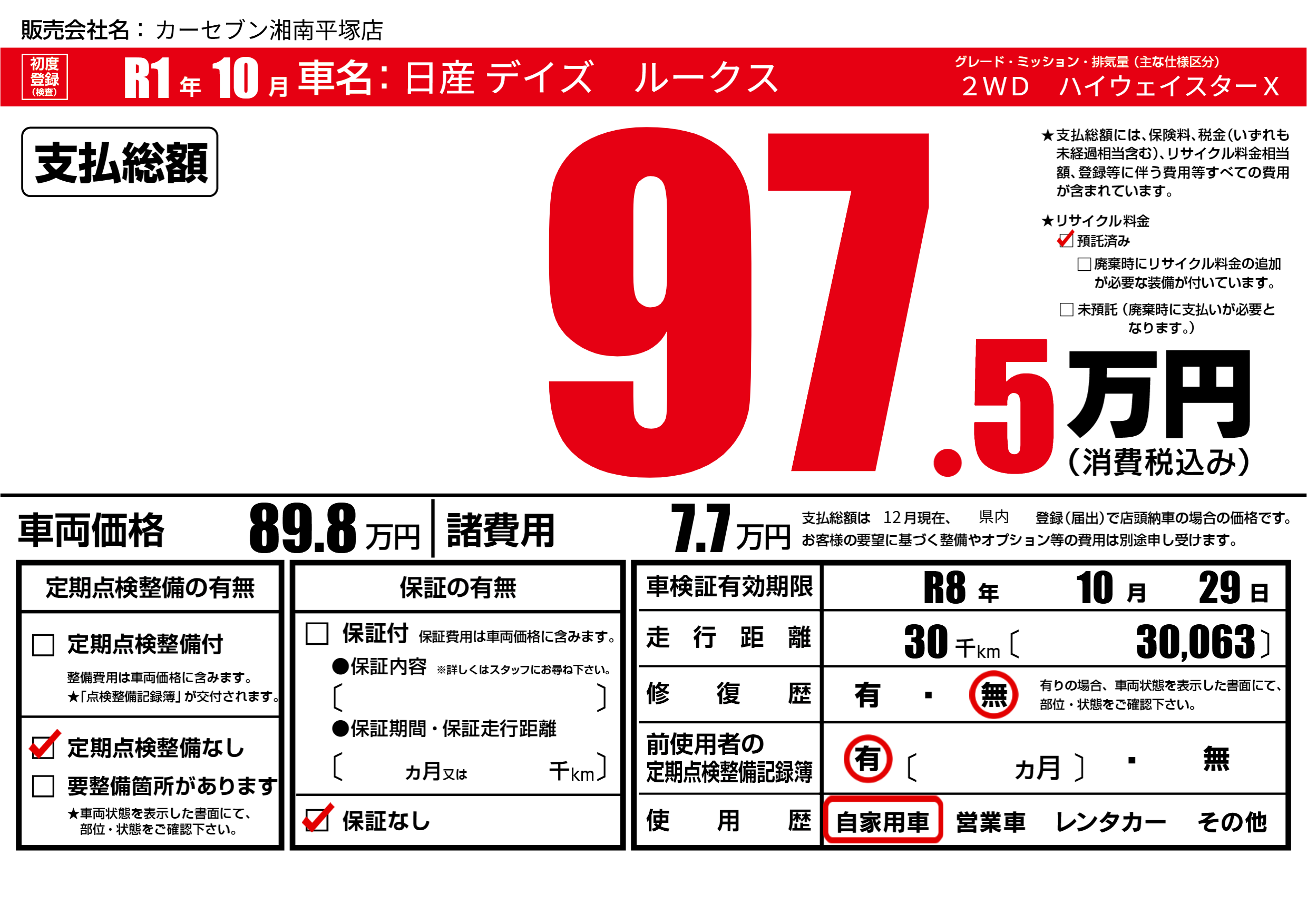 | 走行キロ | 3万km | 初年度登録 | R1年10月 |