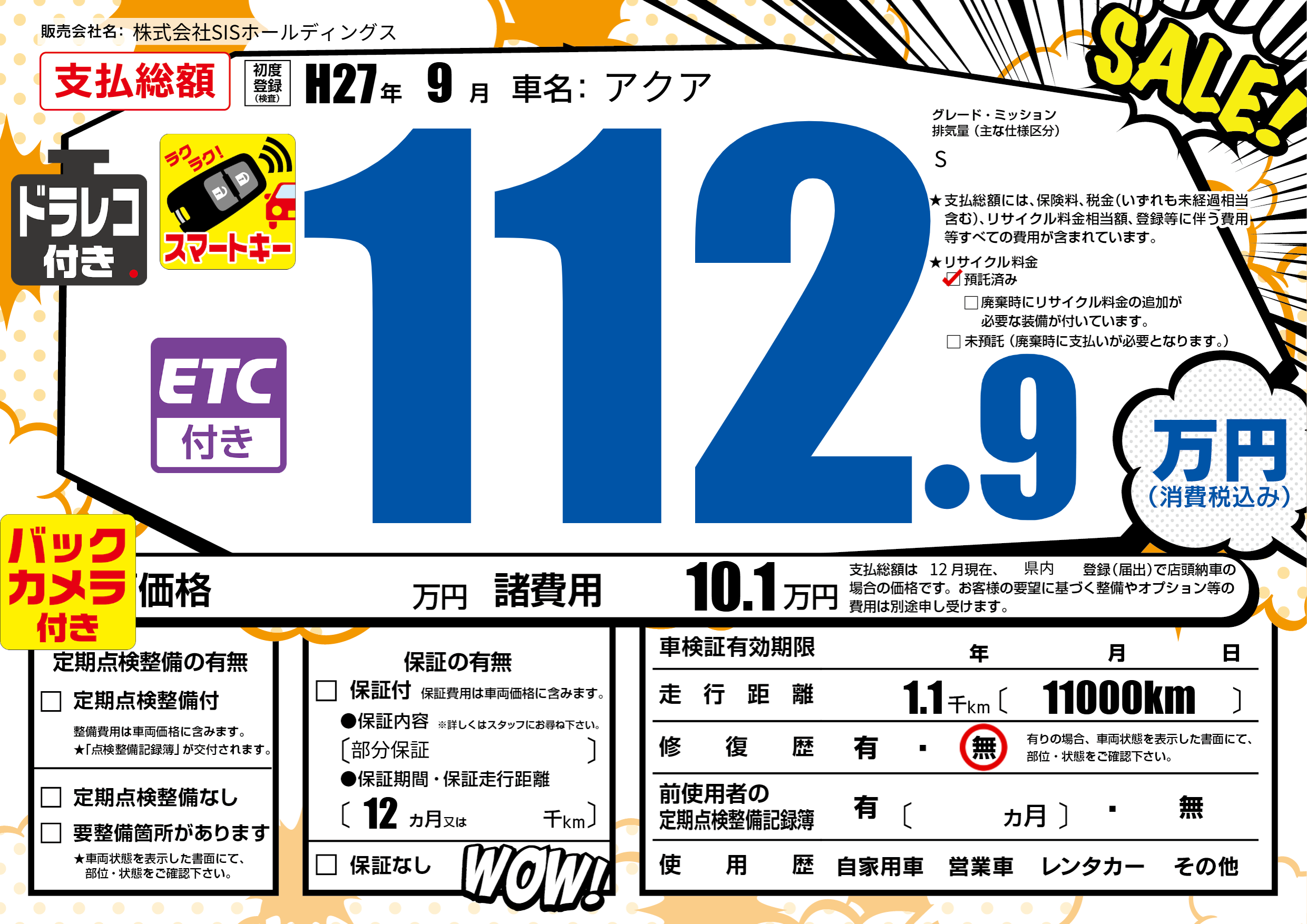 | 走行キロ | 0.1万km | 初年度登録 | H27年9月 |