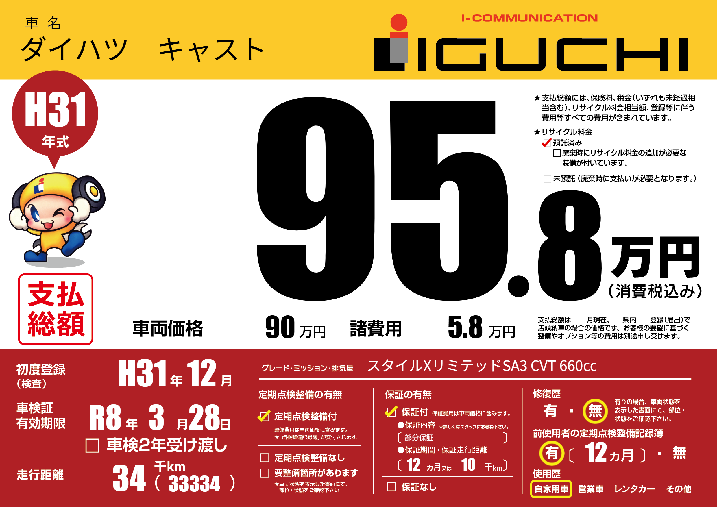 | 車名 | ダイハツ キャスト | グレード ミッション 排気量 |