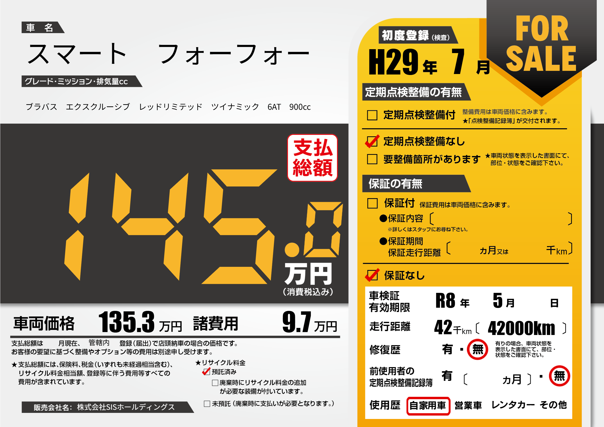 | 車名 | スマート フォーフォー | グレード ミッション 排気量 |