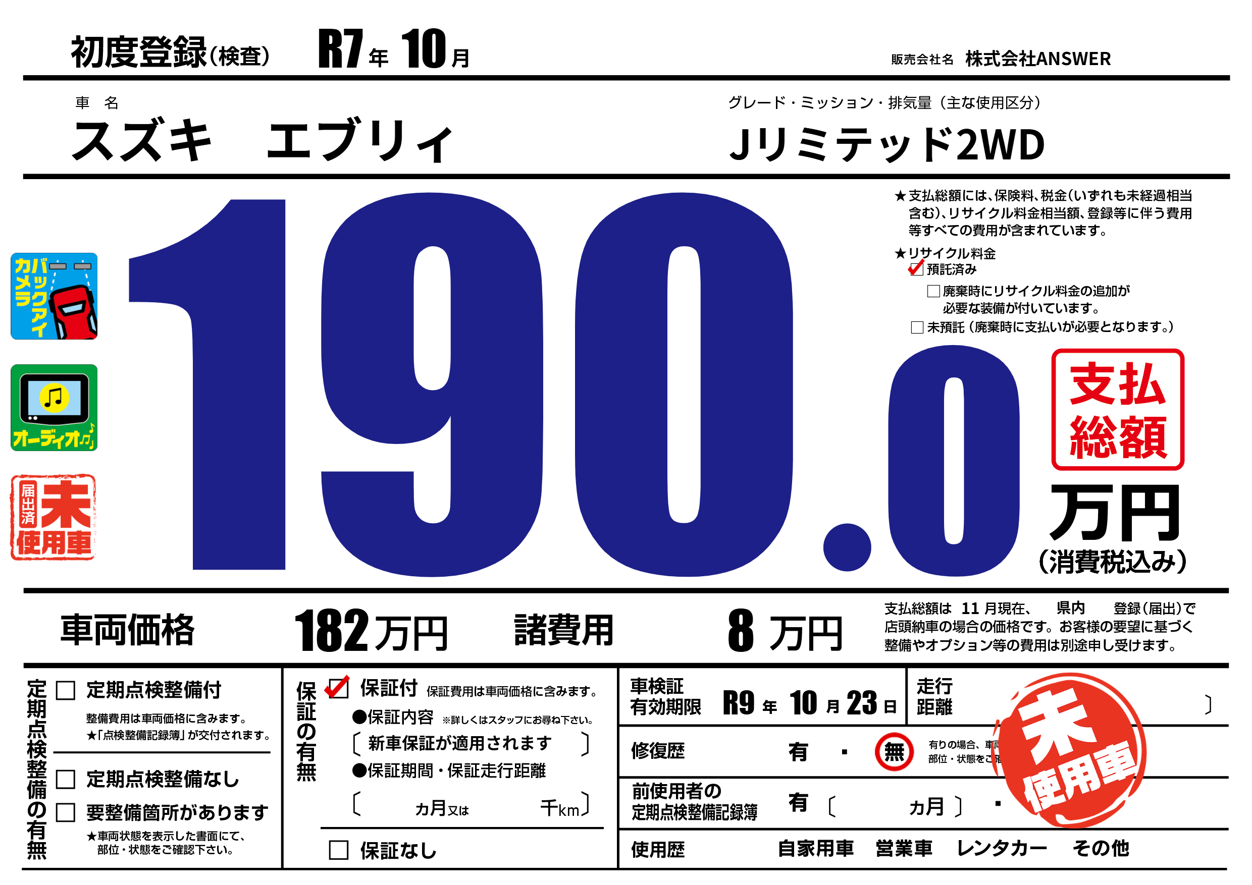 | 走行キロ | - | 初年度登録 | R7年10月 |