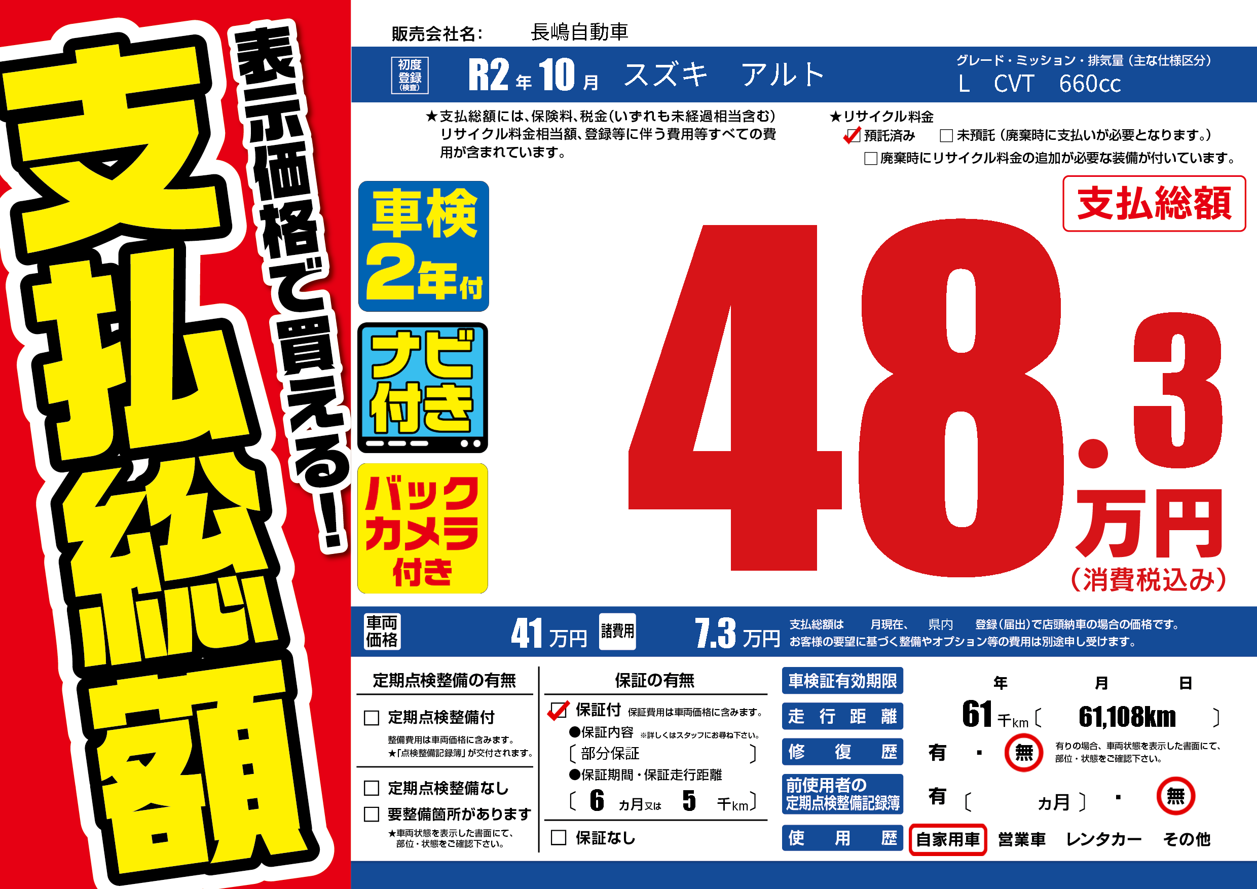 | 車名 | スズキ アルト | グレード ミッション 排気量 |