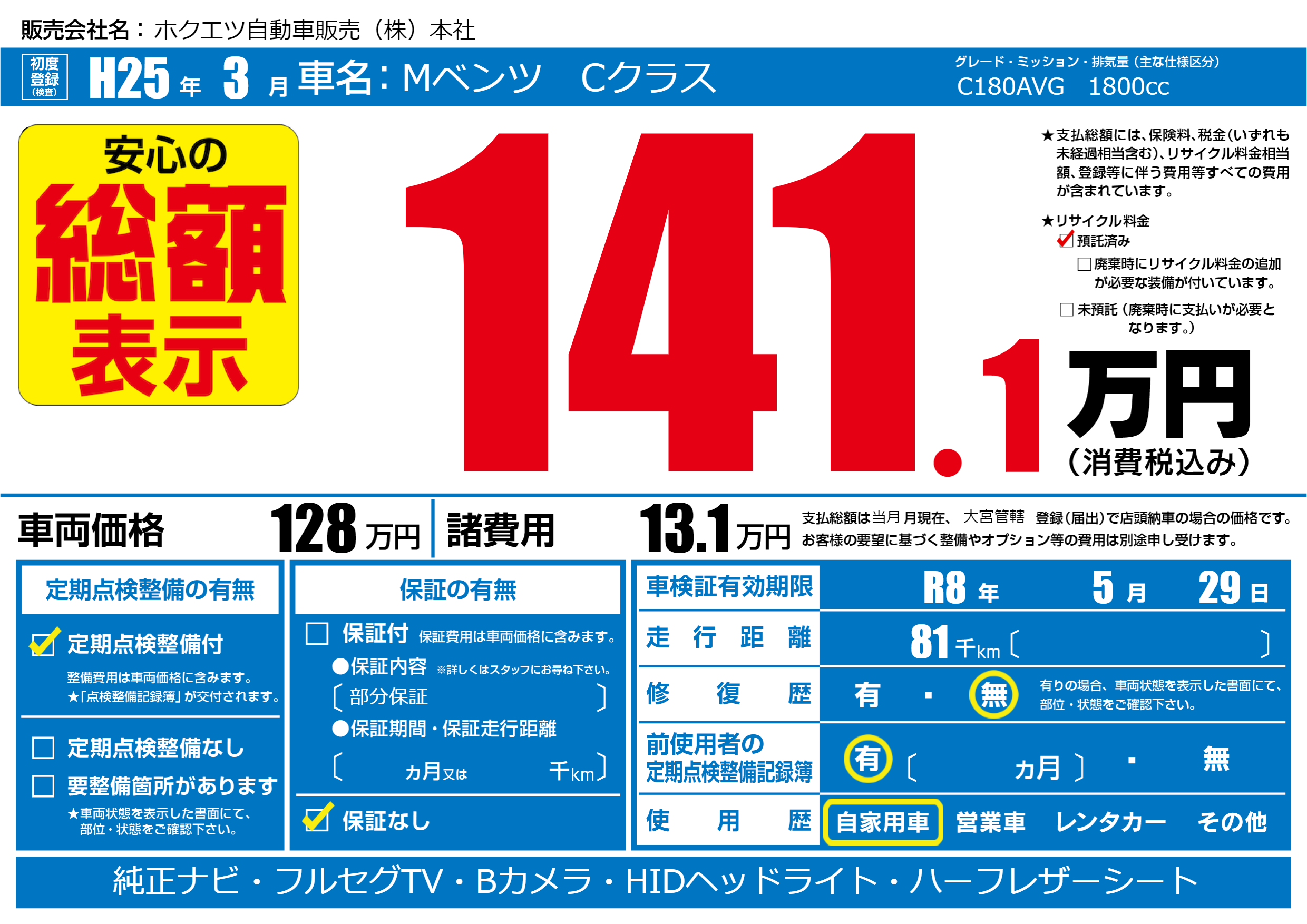 | 車名 | Mベンツ Cクラス | グレード ミッション 排気量 |