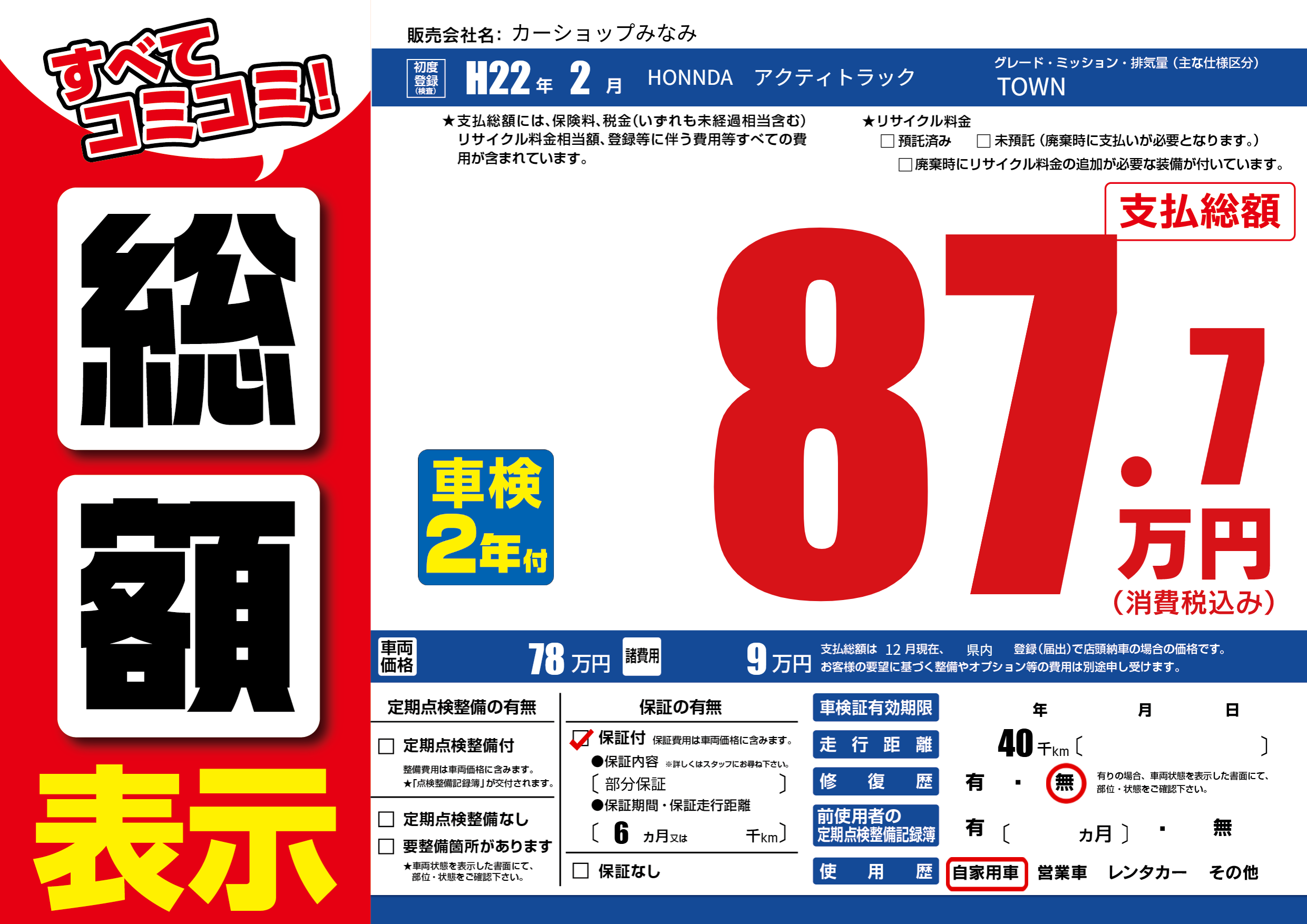 | 車名 | HONNDA アクティトラック | グレード ミッション 排気量 |