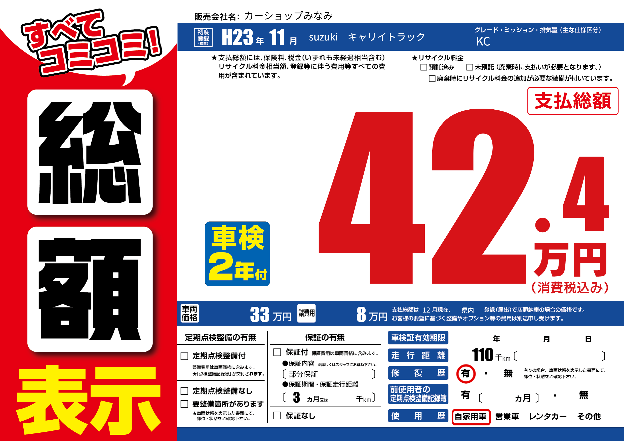 | 走行キロ | 11万km | 初年度登録 | H23年11月 |