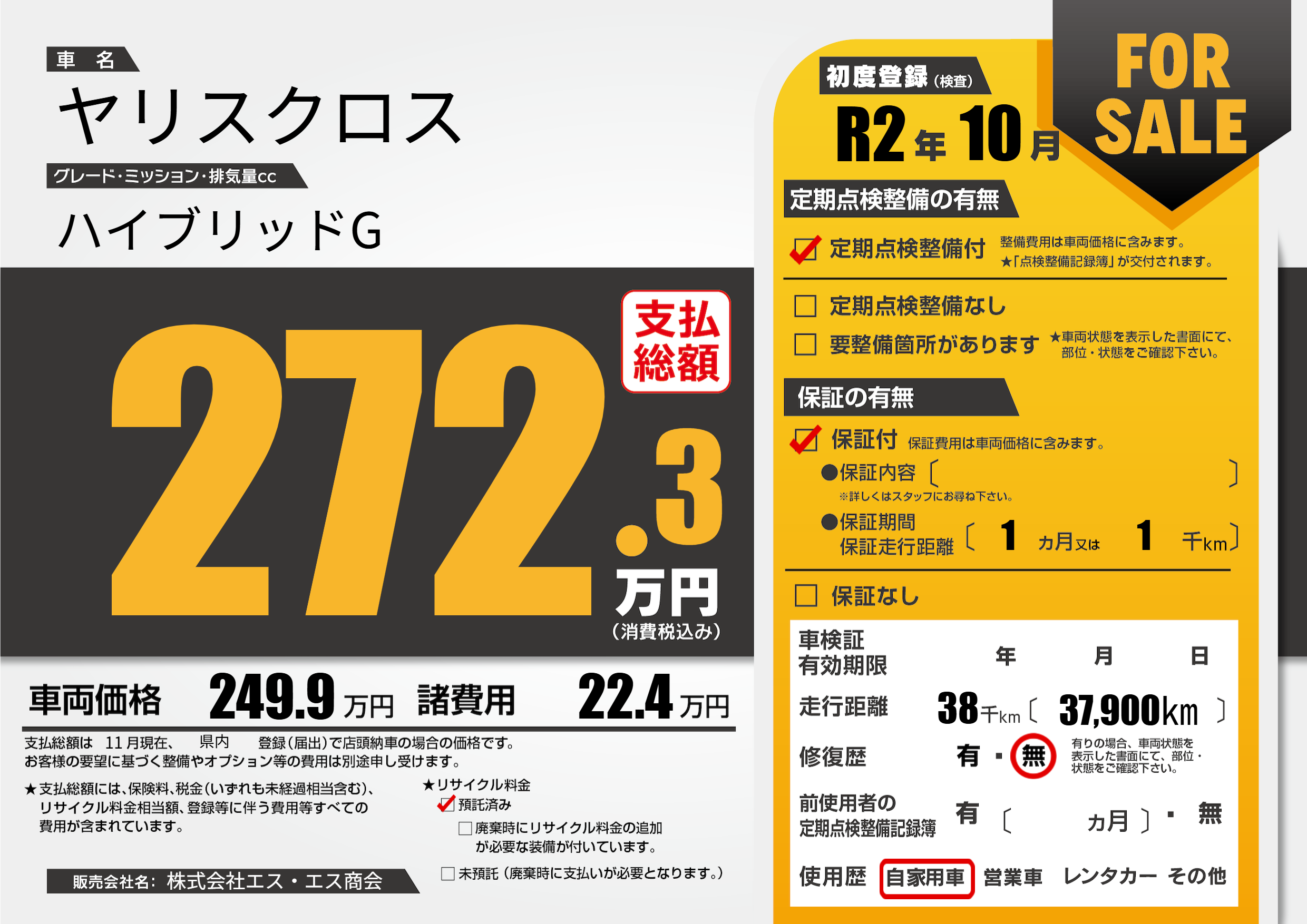 | 走行キロ | 3.8万km | 初年度登録 | R2年10月 |