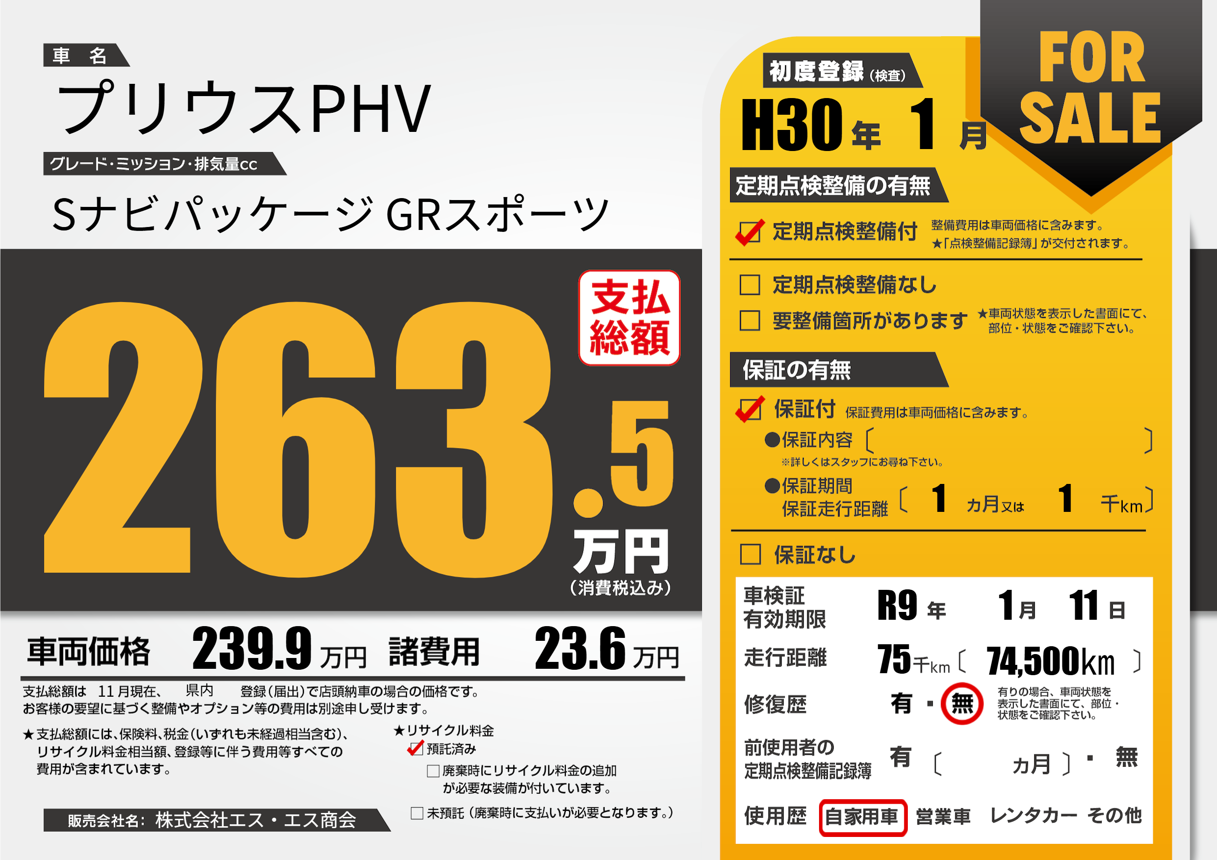 | 車名 | プリウスPHV | グレード ミッション 排気量 |